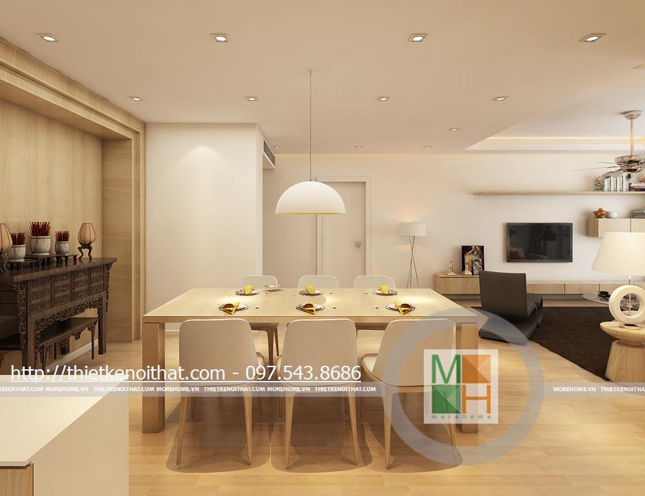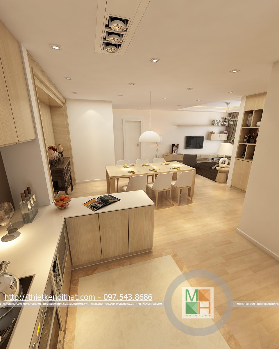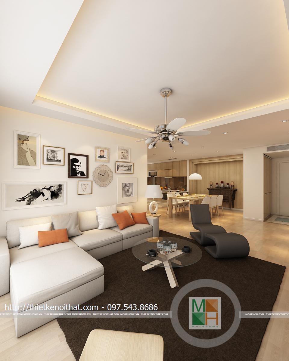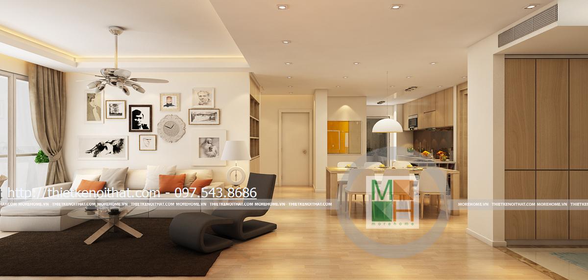 Phòng khách nổi bật bởi bộ sofa trắng trang nhã kết hợp với tấm thảm đen đơn giản mà nhã nhặn. Bên cạnh đó là một chiếc ghế tựa đen được cách điệu một cách trừu tượng như một tác phẩm nghệ thuật. Kệ tivi được làm bằng gỗ và kệ sách được lắp ở những mảng tường trống cạnh tivi vừa tiện lợi lại vừa có tác dụng trang trí. Mảng tường phía sau sofa có treo tranh ảnh trừu tượng tạo tính nghệ thuật và tăng phần sang trọng cho căn phòng. Phòng khách được ngăn với loggia bằng cửa kính để tận dụng ánh sáng thiên nhiên và làm không gian thoáng hơn. Bức tường nhỏ giữa phòng khách và bàn ăn có kê tủ để đồ kết hợp tủ rượu âm để tiết kiệm diện tích và trang trí, tránh nhàm mắt. Bàn ăn bằng gỗ được thiết kế dành cho 6 người nhưng có thể bổ sung thêm chỗ ngồi. Ghế ăn có bọc đệm trắng để phù hợp với tông màu chính của ngôi nhà. Mảng tường trống bên cạnh bàn ăn được lát gỗ và được tận dụng làm vị trí kê bàn thờ, không gây ảnh hưởng đến việc di chuyển. Bếp và bàn ăn được ngăn cách bằng một ngăn lửng, và được thiết kế thành một tủ để đồ nhỏ. Không gian bếp không rộng và nằm ở góc khuất nhưng vẫn đầy đủ tiện nghi và đảm bảo ánh sáng. Tủ bếp trên và dưới đều làm bằng gỗ sáng màu để đồng bộ với nội thất. Phần tường ở gần bếp được lát một lớp kính để dễ dàng cho việc lau chùi sau khi nấu nướng. Phần tường đối diện bếp có kê tủ lạnh âm và chen thêm vào những ngăn tủ gỗ tiện lợi. Không gian bếp được làm sáng bằng dãy đèn downlight trên trần và ở vị trí tủ bếp treo tường. Đi qua bếp sâu vào trong là khu vực đặt máy giặt. Căn phòng có lắp giá để đồ nhỏ để đặt quần áo và được trang trí với những chậu cây nhỏ. Sàn nhà ở đây không lát gỗ mà lát đá bóng để tránh ảnh hưởng do nước khi giặt đồ gây ra.