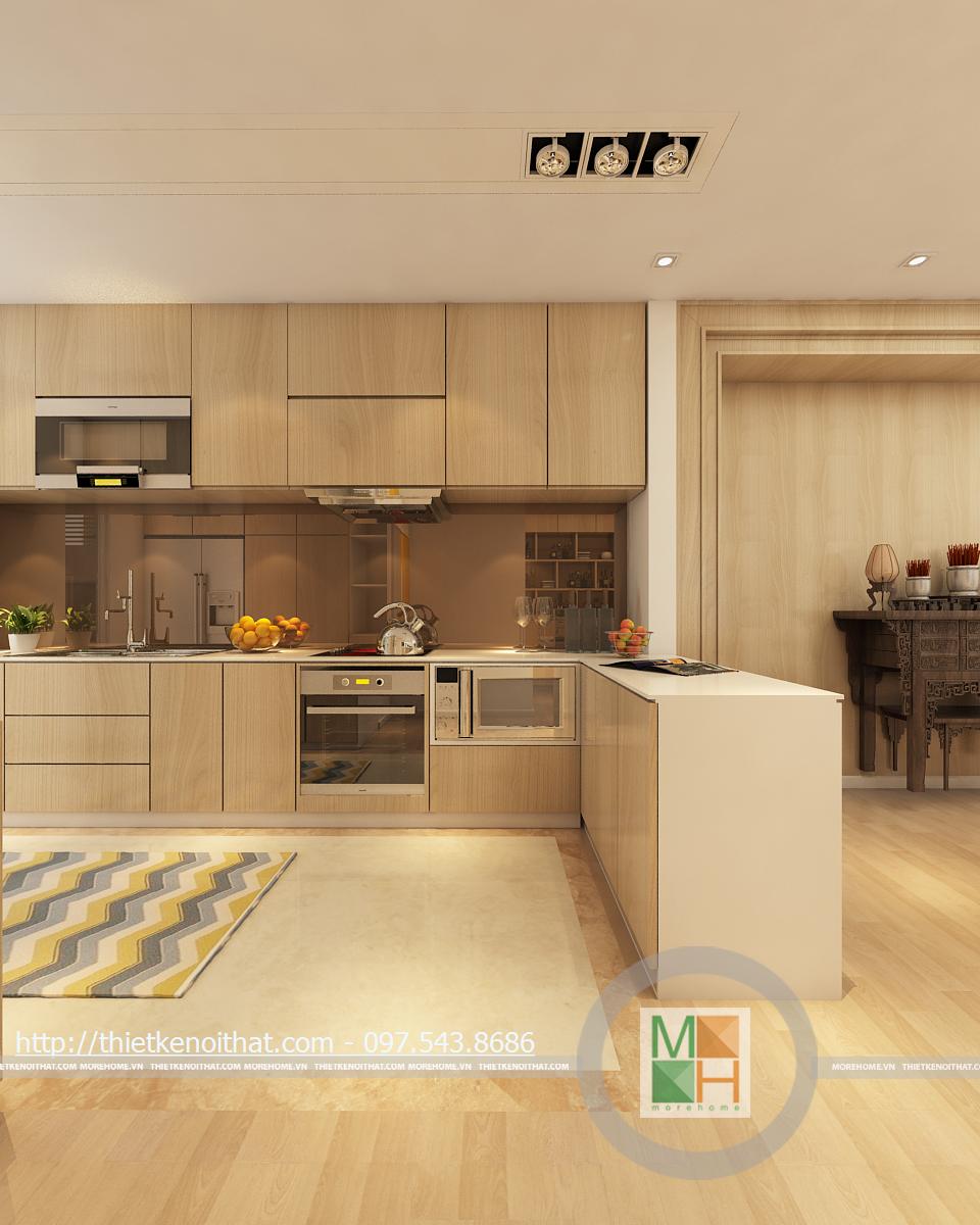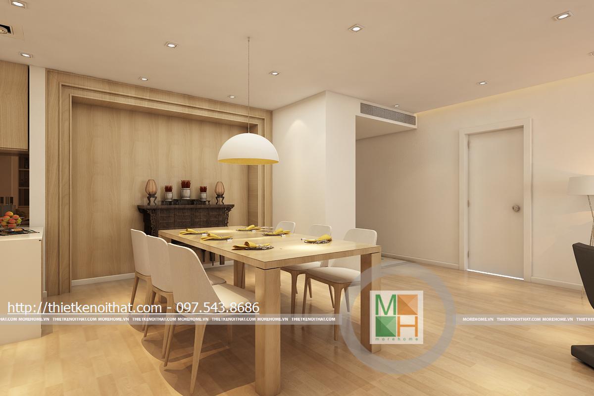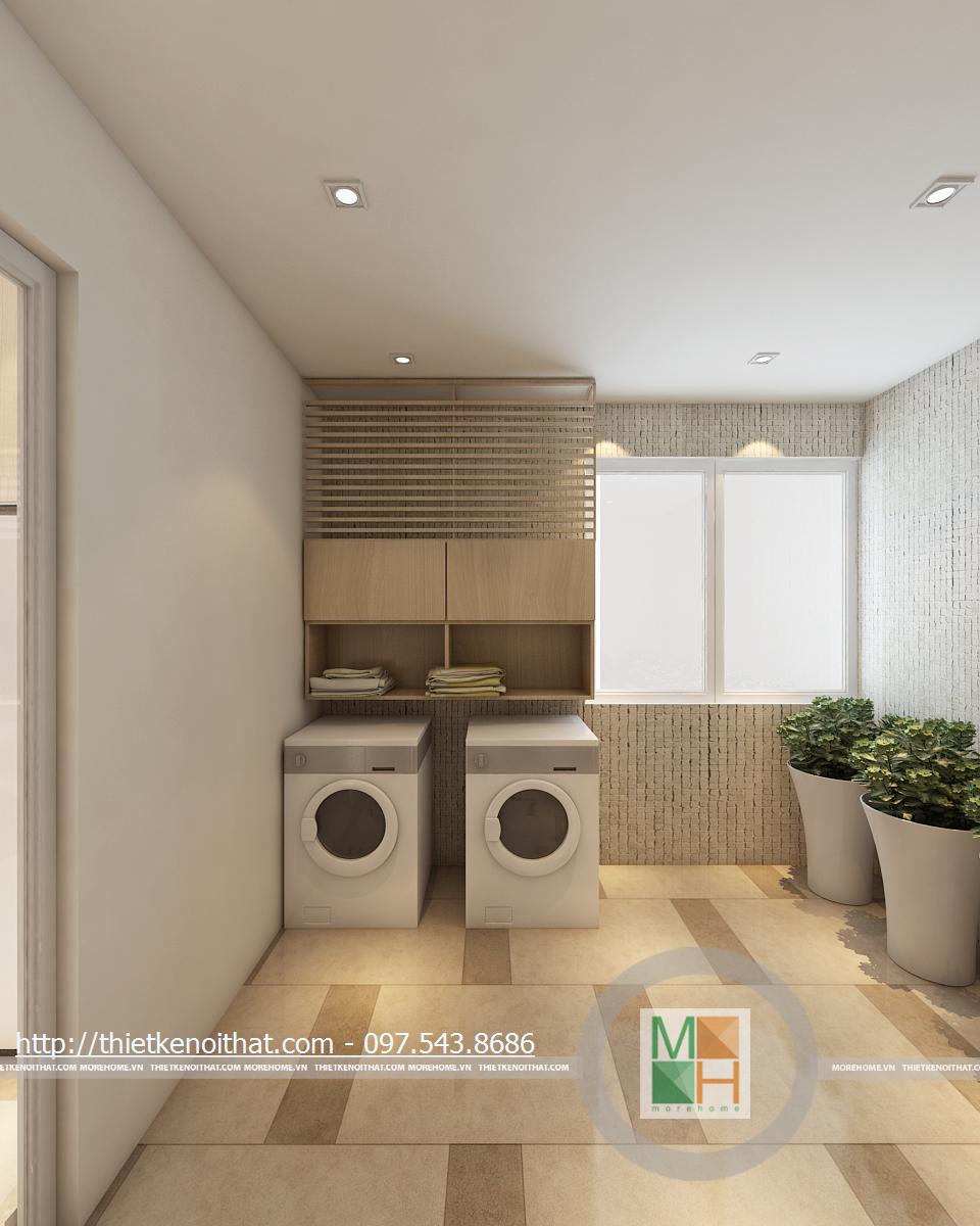 Phòng khách nổi bật bởi bộ sofa trắng trang nhã kết hợp với tấm thảm đen đơn giản mà nhã nhặn. Bên cạnh đó là một chiếc ghế tựa đen được cách điệu một cách trừu tượng như một tác phẩm nghệ thuật. Kệ tivi được làm bằng gỗ và kệ sách được lắp ở những mảng tường trống cạnh tivi vừa tiện lợi lại vừa có tác dụng trang trí. Mảng tường phía sau sofa có treo tranh ảnh trừu tượng tạo tính nghệ thuật và tăng phần sang trọng cho căn phòng. Phòng khách được ngăn với loggia bằng cửa kính để tận dụng ánh sáng thiên nhiên và làm không gian thoáng hơn. Bức tường nhỏ giữa phòng khách và bàn ăn có kê tủ để đồ kết hợp tủ rượu âm để tiết kiệm diện tích và trang trí, tránh nhàm mắt. Bàn ăn bằng gỗ được thiết kế dành cho 6 người nhưng có thể bổ sung thêm chỗ ngồi. Ghế ăn có bọc đệm trắng để phù hợp với tông màu chính của ngôi nhà. Mảng tường trống bên cạnh bàn ăn được lát gỗ và được tận dụng làm vị trí kê bàn thờ, không gây ảnh hưởng đến việc di chuyển. Bếp và bàn ăn được ngăn cách bằng một ngăn lửng, và được thiết kế thành một tủ để đồ nhỏ. Không gian bếp không rộng và nằm ở góc khuất nhưng vẫn đầy đủ tiện nghi và đảm bảo ánh sáng. Tủ bếp trên và dưới đều làm bằng gỗ sáng màu để đồng bộ với nội thất. Phần tường ở gần bếp được lát một lớp kính để dễ dàng cho việc lau chùi sau khi nấu nướng. Phần tường đối diện bếp có kê tủ lạnh âm và chen thêm vào những ngăn tủ gỗ tiện lợi. Không gian bếp được làm sáng bằng dãy đèn downlight trên trần và ở vị trí tủ bếp treo tường. Đi qua bếp sâu vào trong là khu vực đặt máy giặt. Căn phòng có lắp giá để đồ nhỏ để đặt quần áo và được trang trí với những chậu cây nhỏ. Sàn nhà ở đây không lát gỗ mà lát đá bóng để tránh ảnh hưởng do nước khi giặt đồ gây ra.