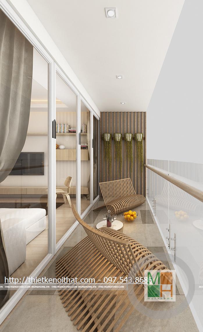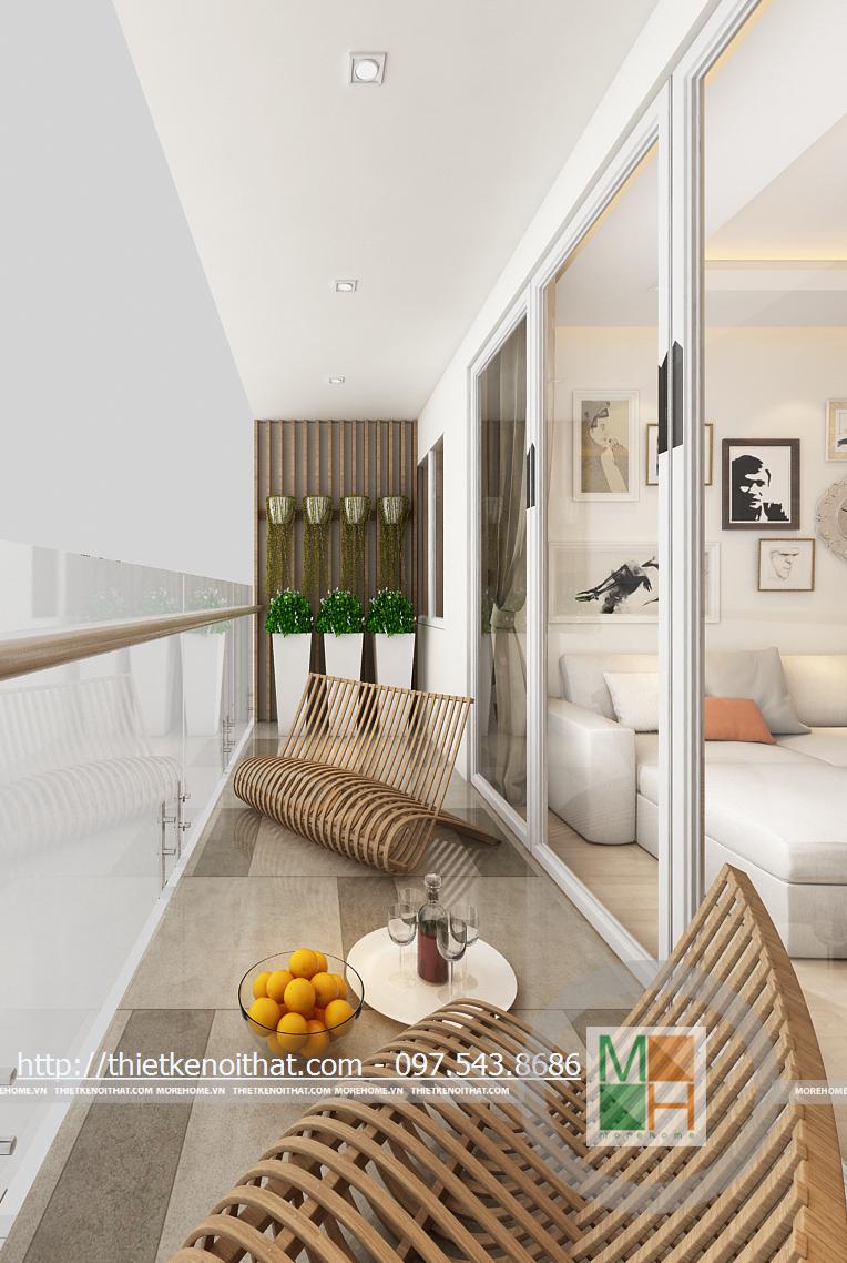 Loggia cạnh phòng khách có kê ghế tựa với kiểu dáng độc đáo để gia chủ có thể ngồi thư giãn. Ngoài ra còn có những chậu cây được bố trí ở hai bên tường để tạo một không gian gần gũi với thiên nhiên nhất.