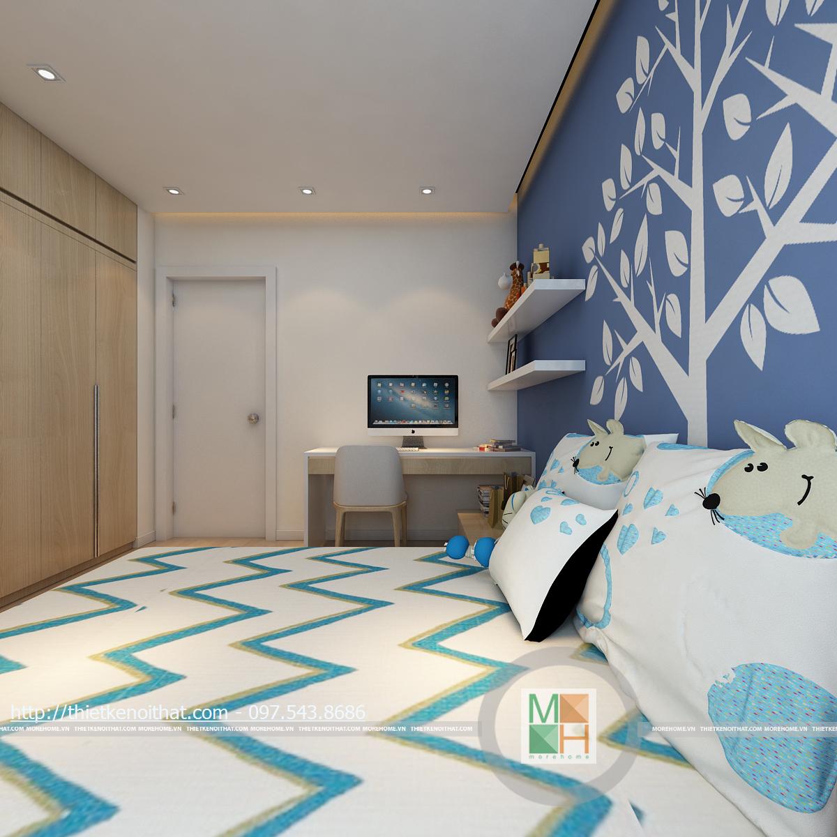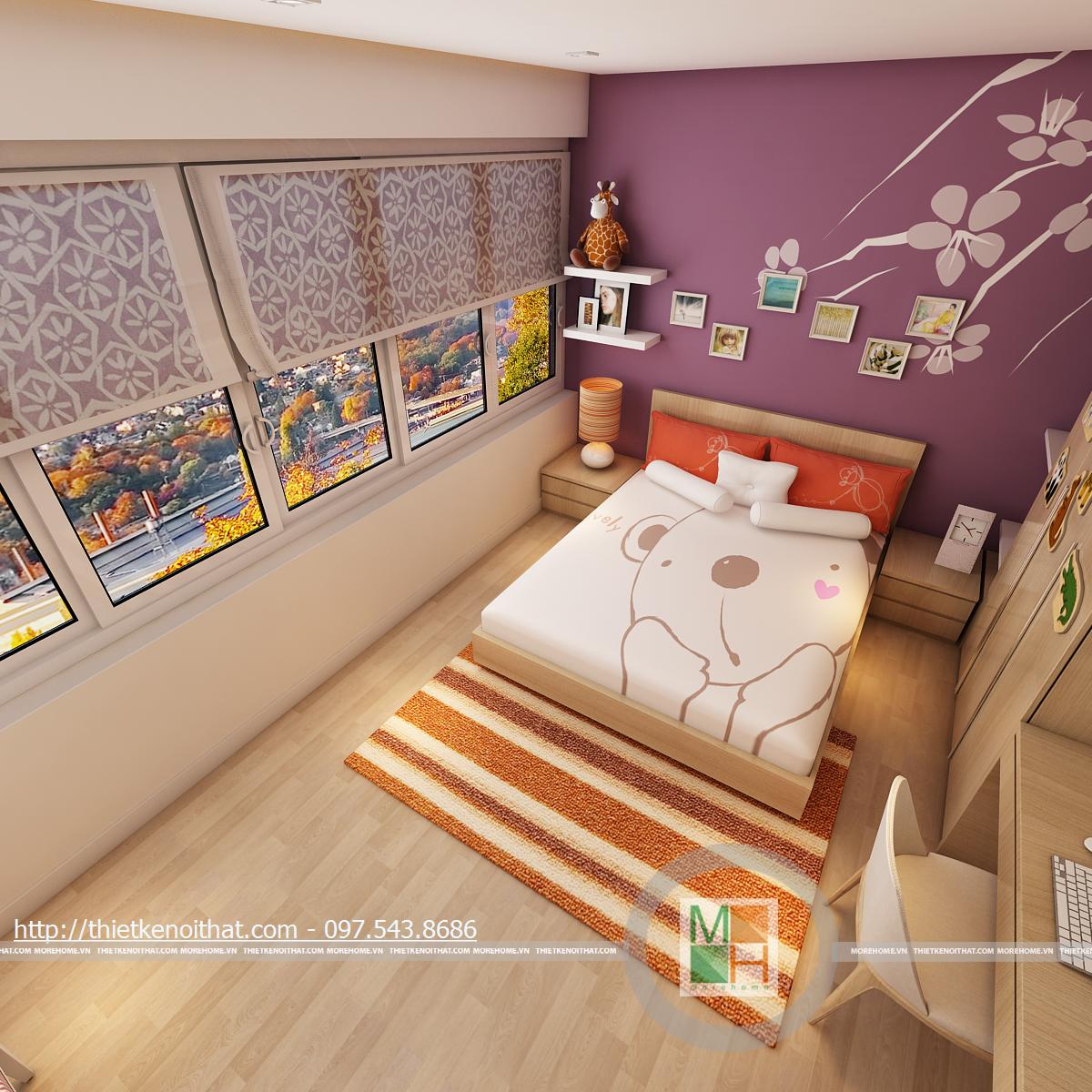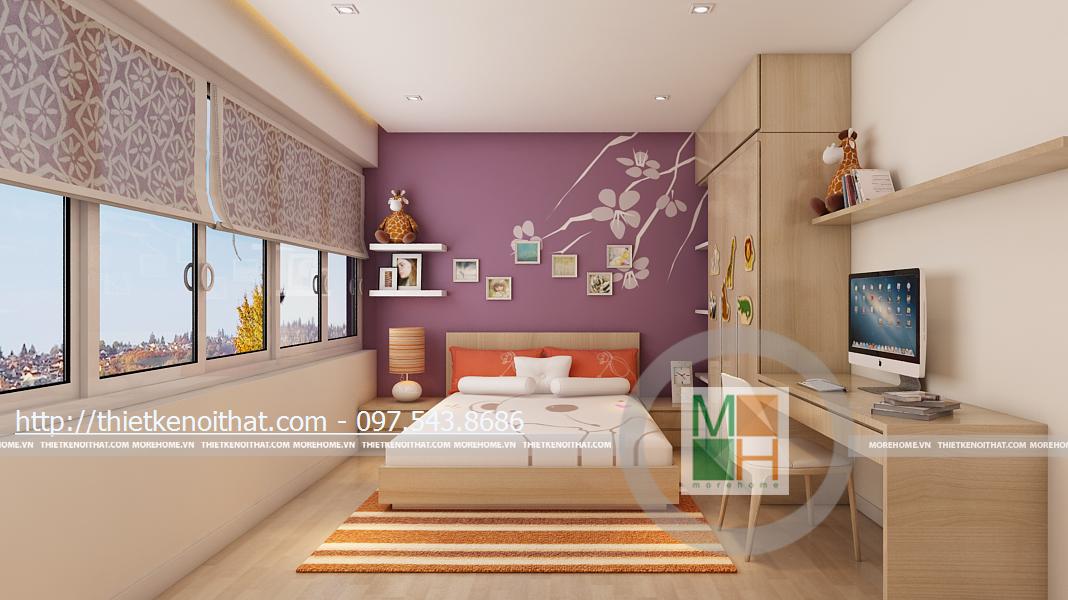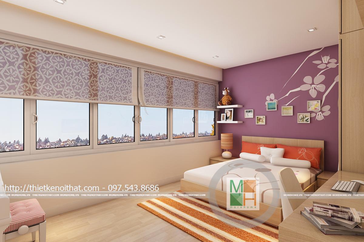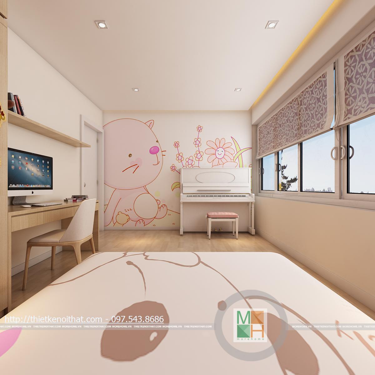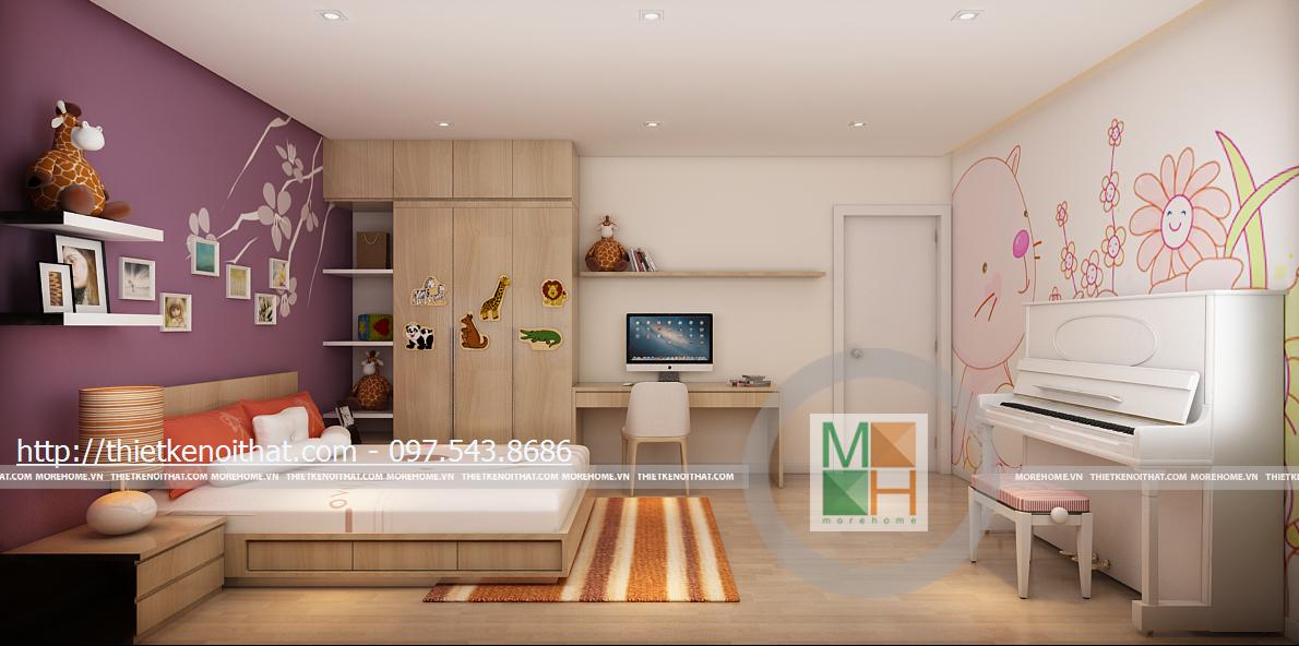 Hai phòng ngủ cho con đều được trang trí với màu sắc trẻ trung và ngộ nghĩnh. Phòng ngủ con gái nổi bật với mảng tường đầu giường sơn màu tím với những họa tiết hoa lá đặc sắc, phá cách. Giường ngủ, táp đầu giường tủ quần áo và bàn học cùng một chất liệu là gỗ sáng màu, đem lại cảm giác ấm áp cho căn phòng. Thêm vào đó, toàn bộ mảng tường bên trái phòng lắp cửa sổ để không gian như rộng hơn và sáng hơn nhờ ánh sáng tự nhiên. Mảng tường đối diện giường có trang trí bằng giấy dán xinh xắn và kê một chiếc piano trắng theo đúng tông màu chính của ngôi nhà. Phòng ngủ con trai thì lại ấn tượng bởi gam màu xanh tinh nghịch. Mảng tường màu xanh đầu giường kết hợp với những chi tiết nhỏ như ga giường, rèm cửa… đã tạo nên điểm nhấn đáng chú ý cho căn phòng. Cũng giống như phòng ngủ con gái, nội thất trong phòng đều là gỗ sáng màu, tuy nhiên bàn làm việc và kệ sách lại được sơn màu trắng để có thể nổi bật trên nền tường xanh.