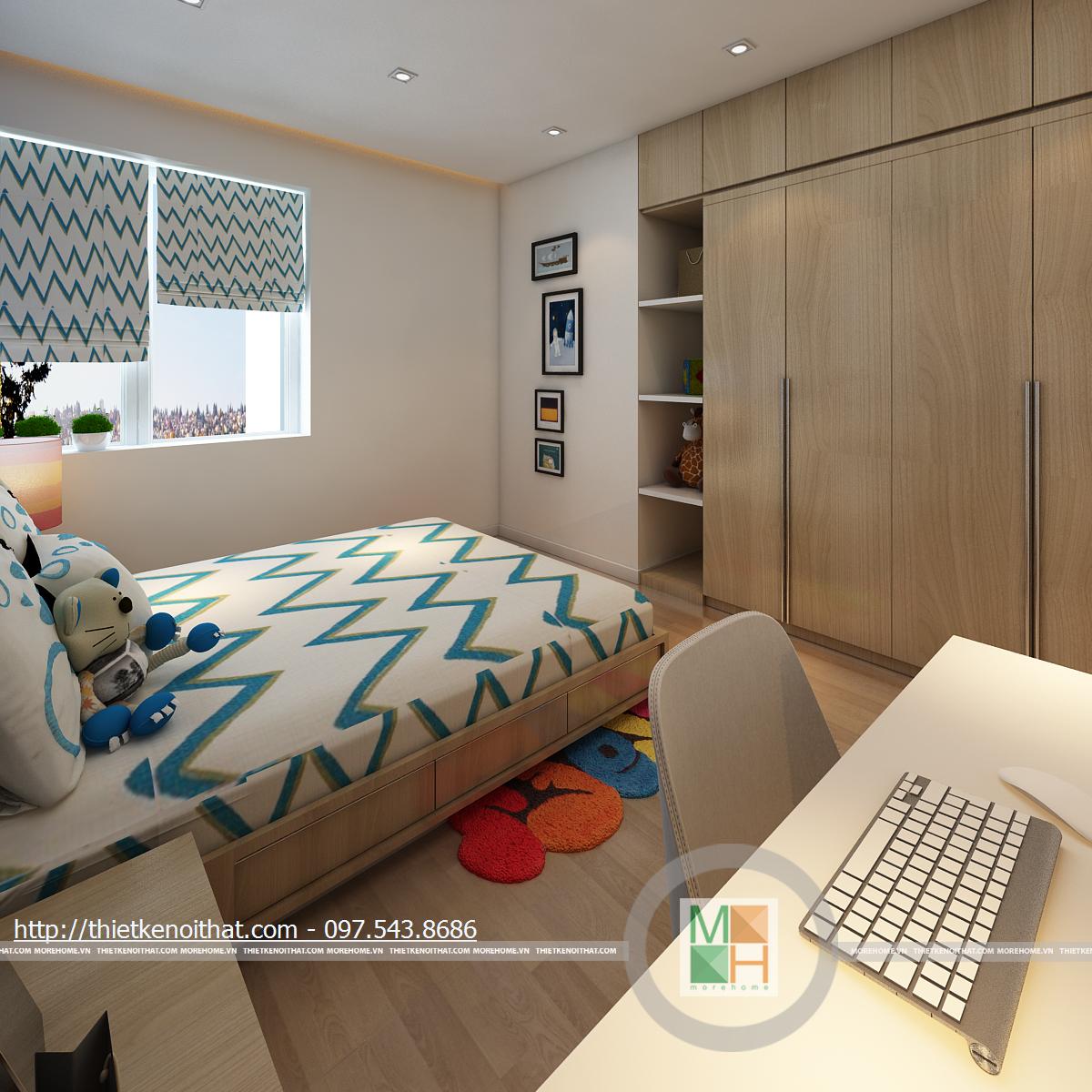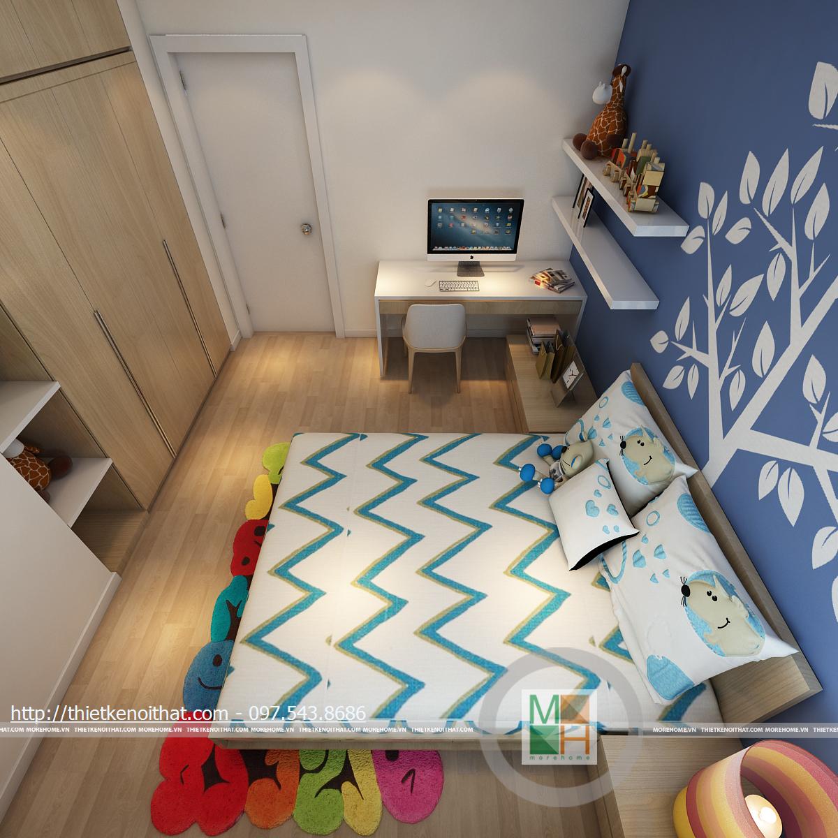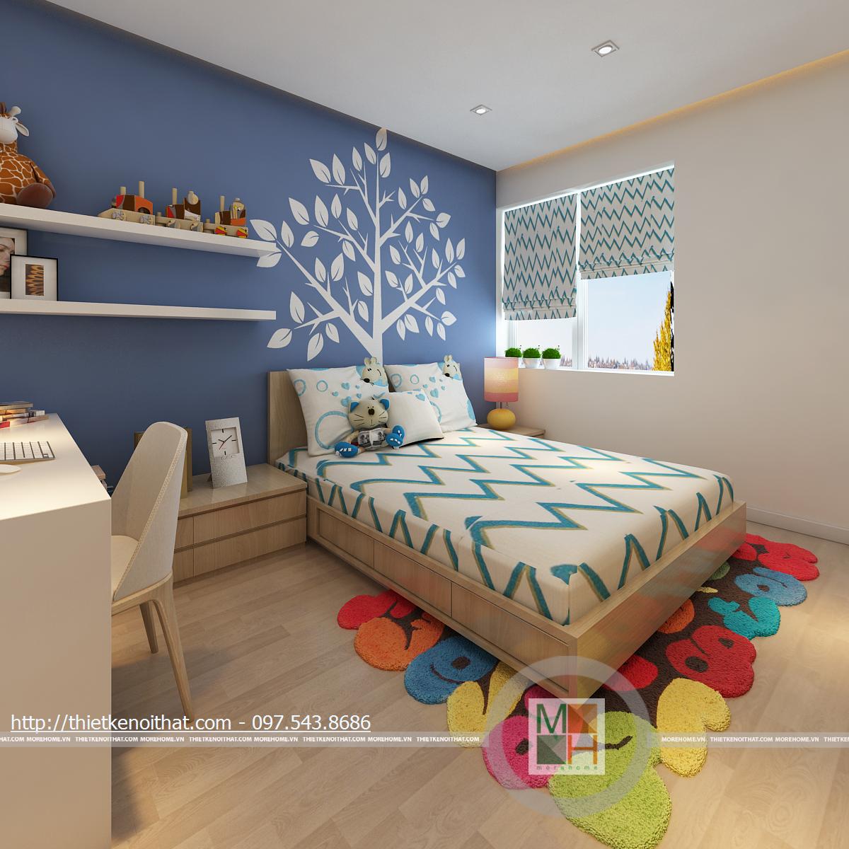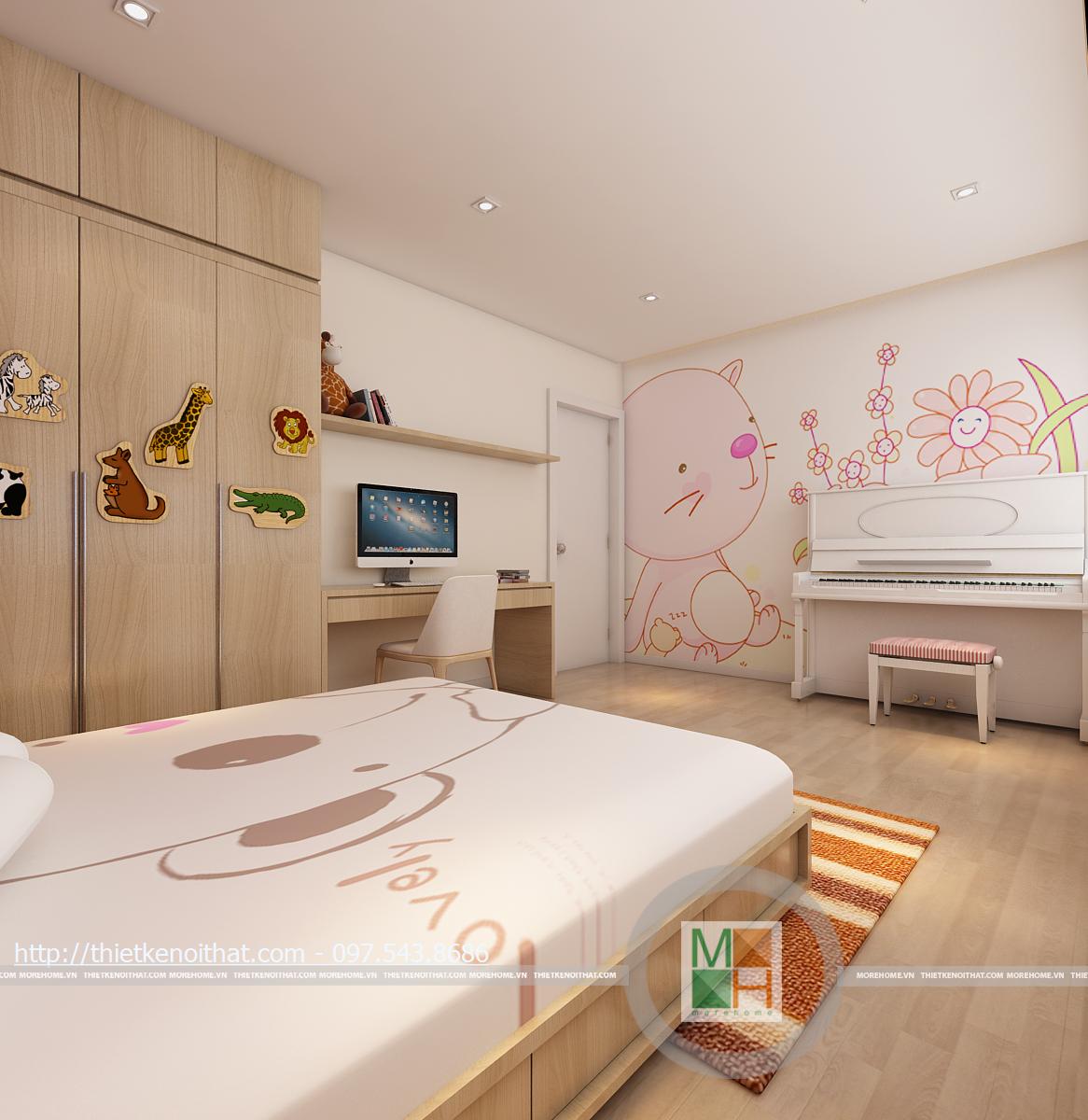 Hai phòng ngủ cho con đều được trang trí với màu sắc trẻ trung và ngộ nghĩnh. Phòng ngủ con gái nổi bật với mảng tường đầu giường sơn màu tím với những họa tiết hoa lá đặc sắc, phá cách. Giường ngủ, táp đầu giường tủ quần áo và bàn học cùng một chất liệu là gỗ sáng màu, đem lại cảm giác ấm áp cho căn phòng. Thêm vào đó, toàn bộ mảng tường bên trái phòng lắp cửa sổ để không gian như rộng hơn và sáng hơn nhờ ánh sáng tự nhiên. Mảng tường đối diện giường có trang trí bằng giấy dán xinh xắn và kê một chiếc piano trắng theo đúng tông màu chính của ngôi nhà. Phòng ngủ con trai thì lại ấn tượng bởi gam màu xanh tinh nghịch. Mảng tường màu xanh đầu giường kết hợp với những chi tiết nhỏ như ga giường, rèm cửa… đã tạo nên điểm nhấn đáng chú ý cho căn phòng. Cũng giống như phòng ngủ con gái, nội thất trong phòng đều là gỗ sáng màu, tuy nhiên bàn làm việc và kệ sách lại được sơn màu trắng để có thể nổi bật trên nền tường xanh.