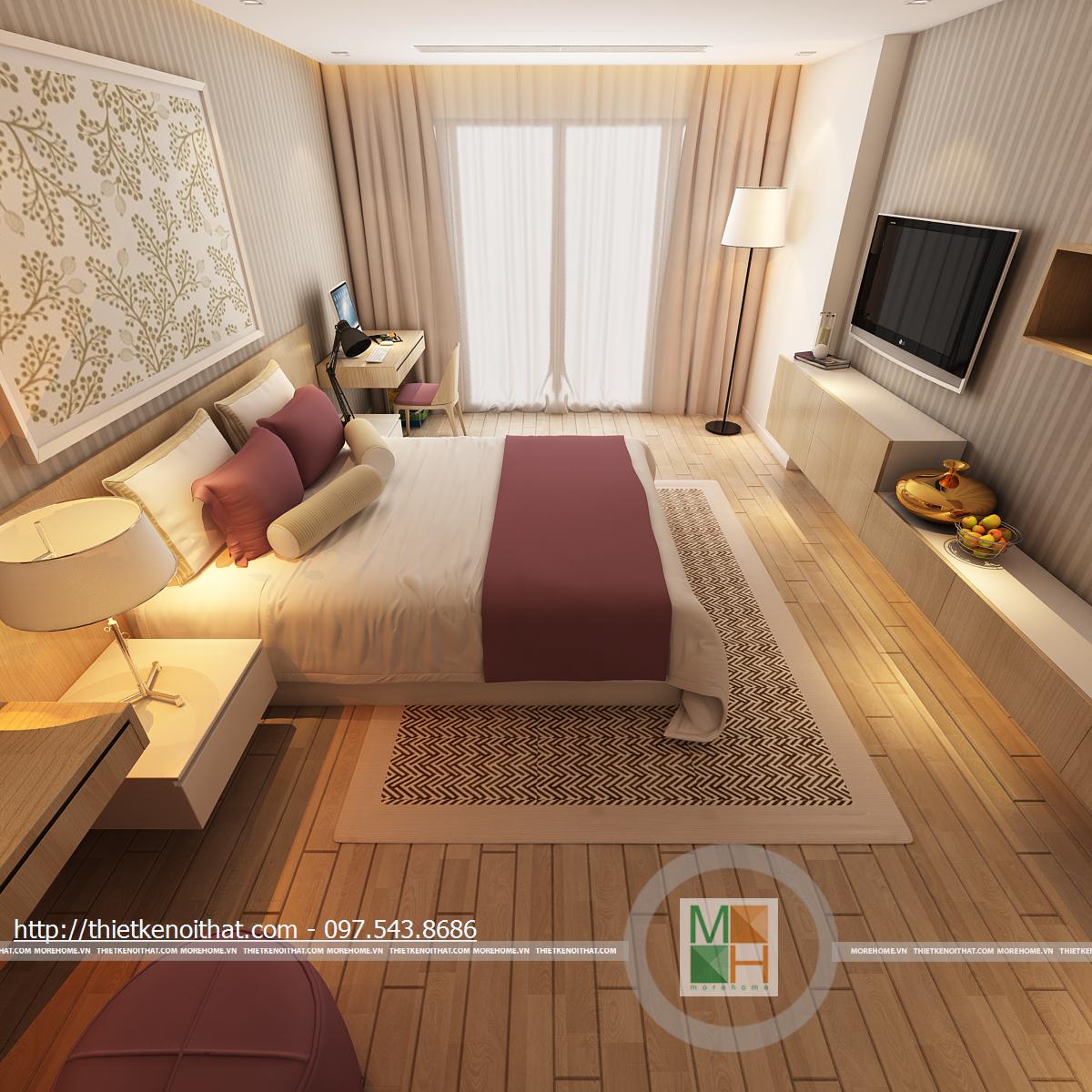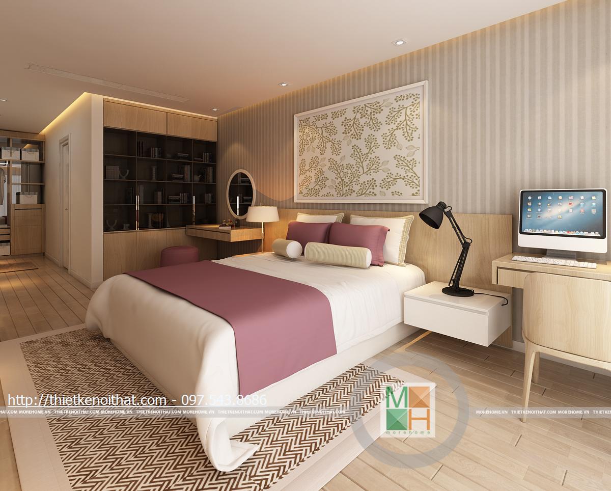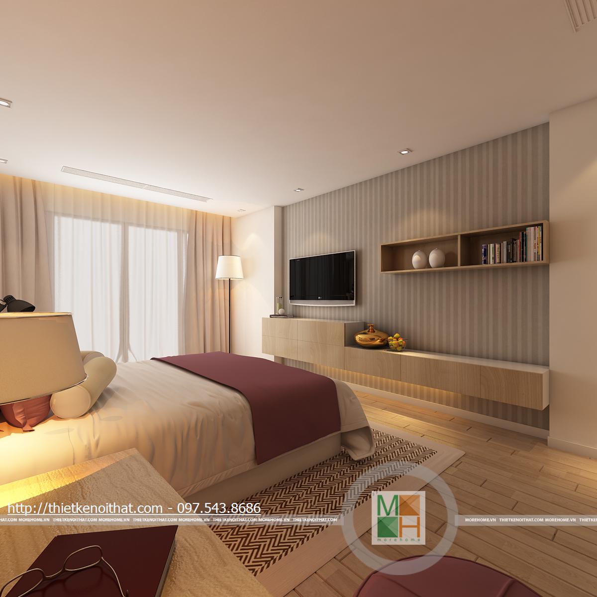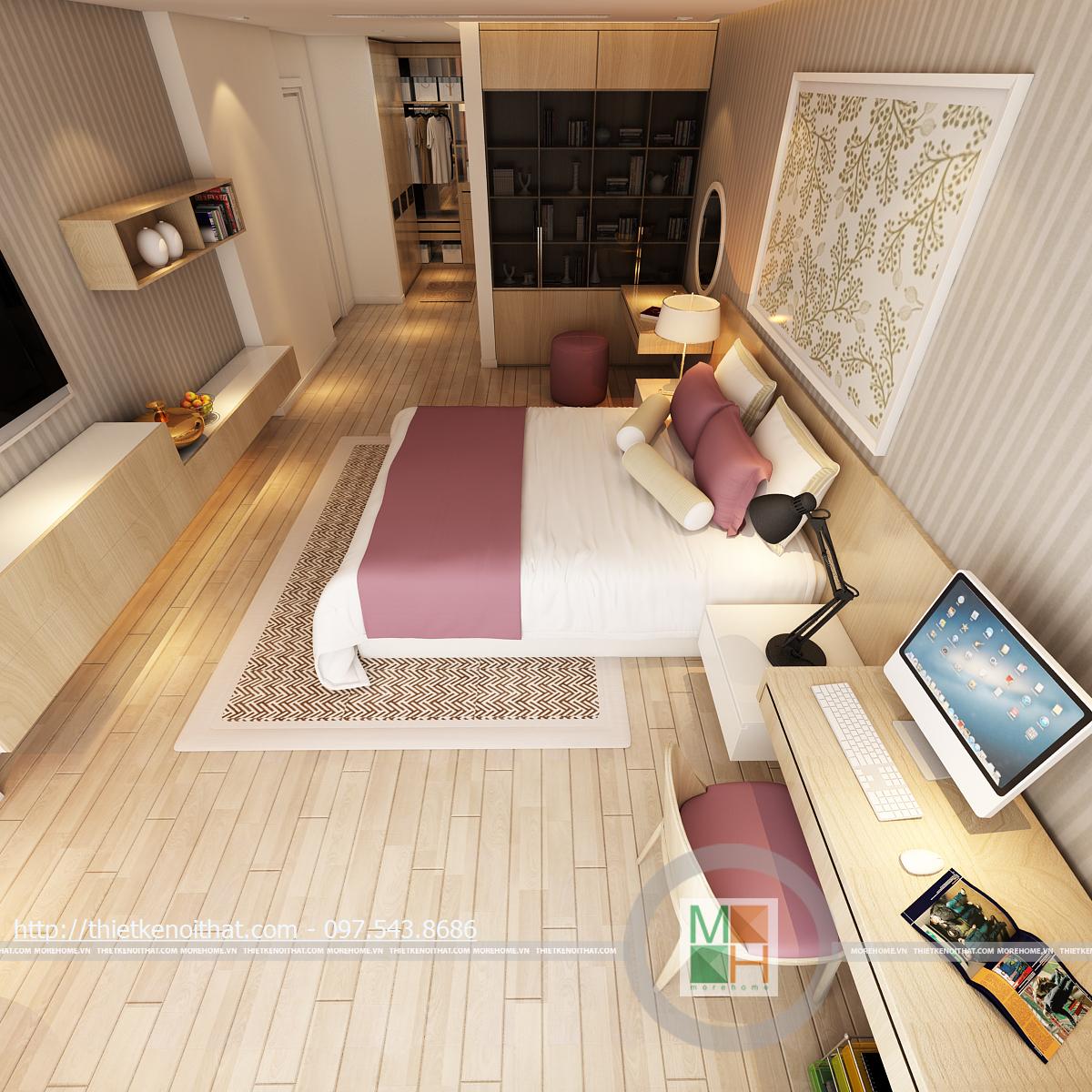 Phòng ngủ chính vẫn có màu sơn chủ đạo là trắng nhưng chen vào là những mảng tường dán giấy kẻ sọc trang nhã. Bàn trang điểm và bàn làm việc được đóng liền vào tường và được bố trí cân xứng hai bên đầu giường. Mảng tường đầu giường treo một bức tranh với họa tiết mềm mại, độc đáo để tạo một không gian lãng mạn. Đầu giường còn được trang trí bởi một tấm gỗ dài kéo ra hai bên và gắn liền với hai chiếc bàn đặt đèn ngủ. Bên cạnh giường là tủ sách âm tường, cao sát trần vừa tiết kiệm diện tích vừa tiện lợi. Kệ tivi và kệ đồ được làm bằng gỗ và được sắp đặt như những khối trang trí bắt mắt. Cửa sổ được làm rộng để ánh sáng mặt trời hướng được vào giường, tốt cho sức khỏe. Căn phòng có một góc nhỏ cạnh cửa ra vào và cửa nhà vệ sinh để đặt tủ quần áo, giầy dép và phụ kiện khác. Tủ quần áo ở đây gồm cả tủ có cánh và tủ không cánh với rất nhiều ngăn nhỏ tiện lợi.