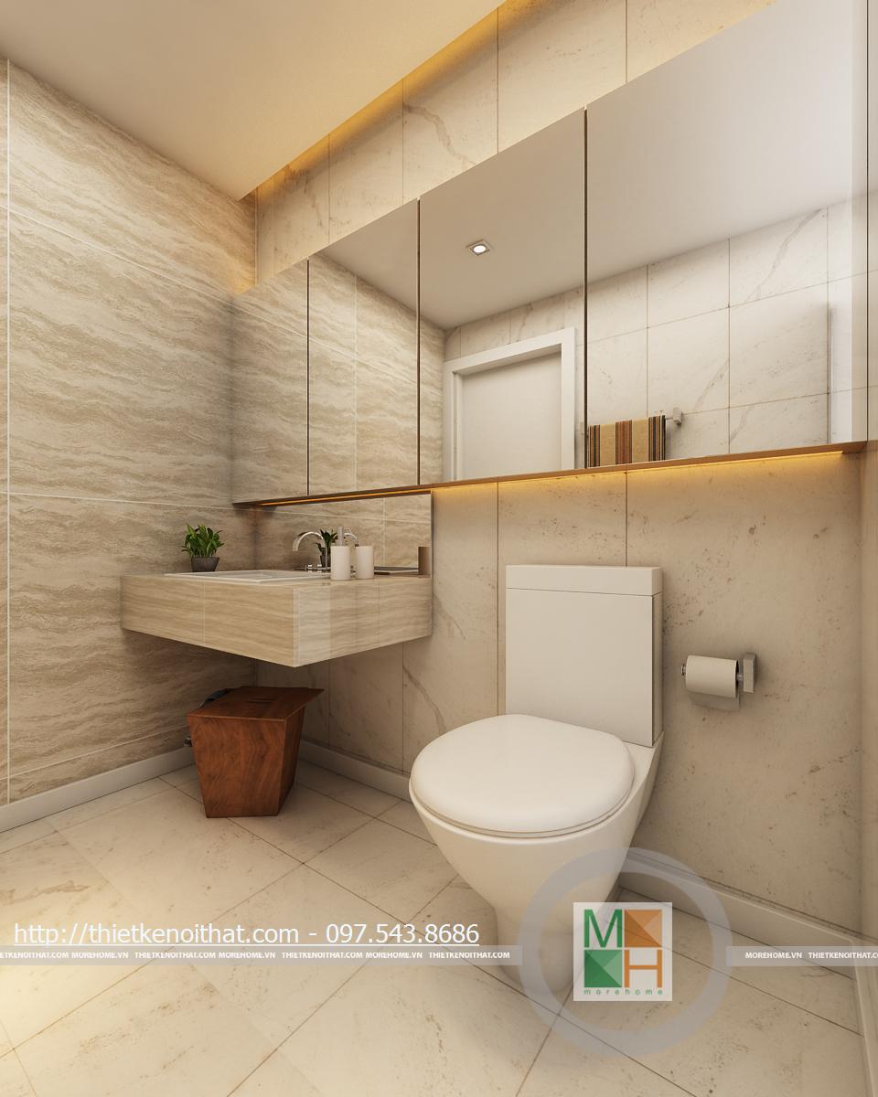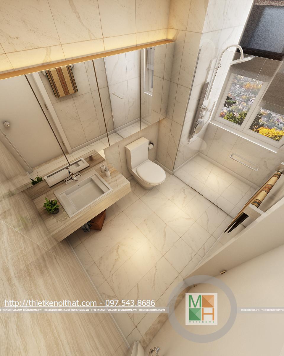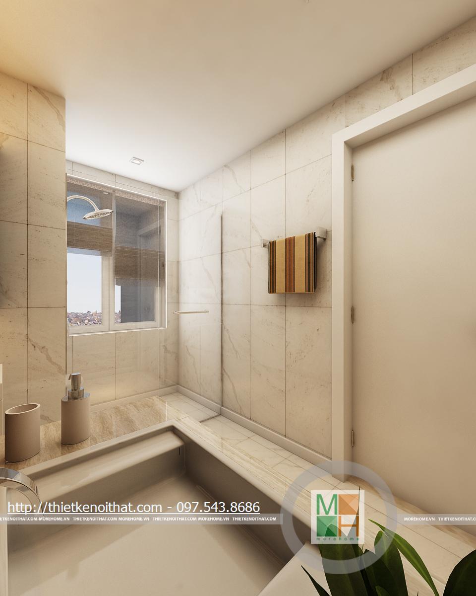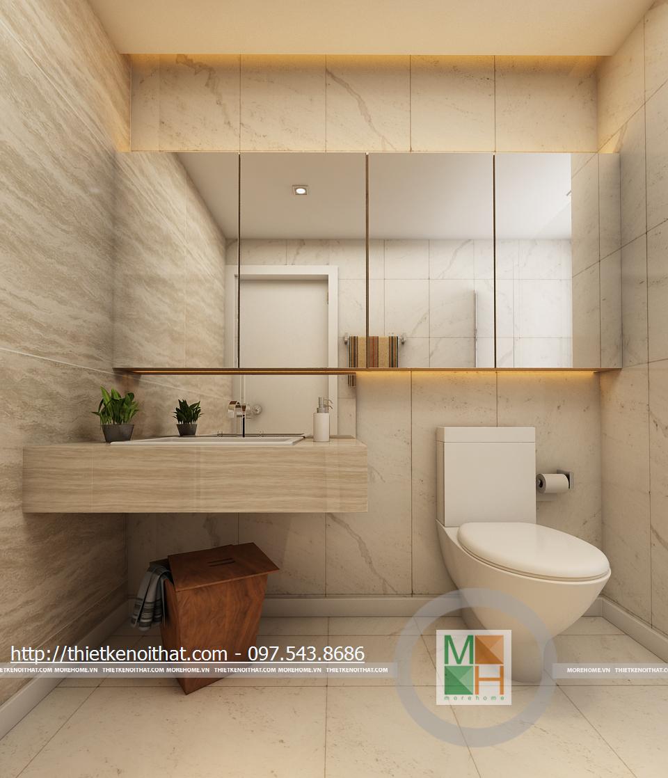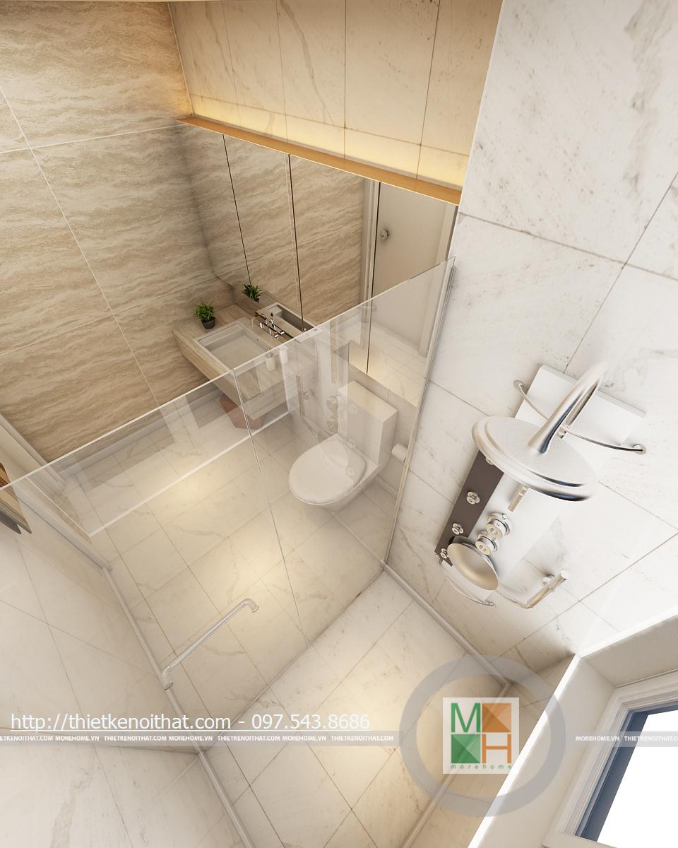 Nhà vệ sinh chung và nhà vệ sinh trong phòng ngủ chính đều được lát nền bằng gạch trắng và sử dụng gạch sáng màu để ốp tường nhằm tạo cảm giác sạch sẽ và thoáng đãng cho không gian nhỏ. Cả hai nhà vệ sinh đều có trang bị bồn tắm đứng tiện lợi và bồn rửa sứ trắng, tuy nhiên ở phòng ngủ chính thì bồn rửa có kết hợp thêm kệ để đồ nhỏ bằng gỗ ở dưới.