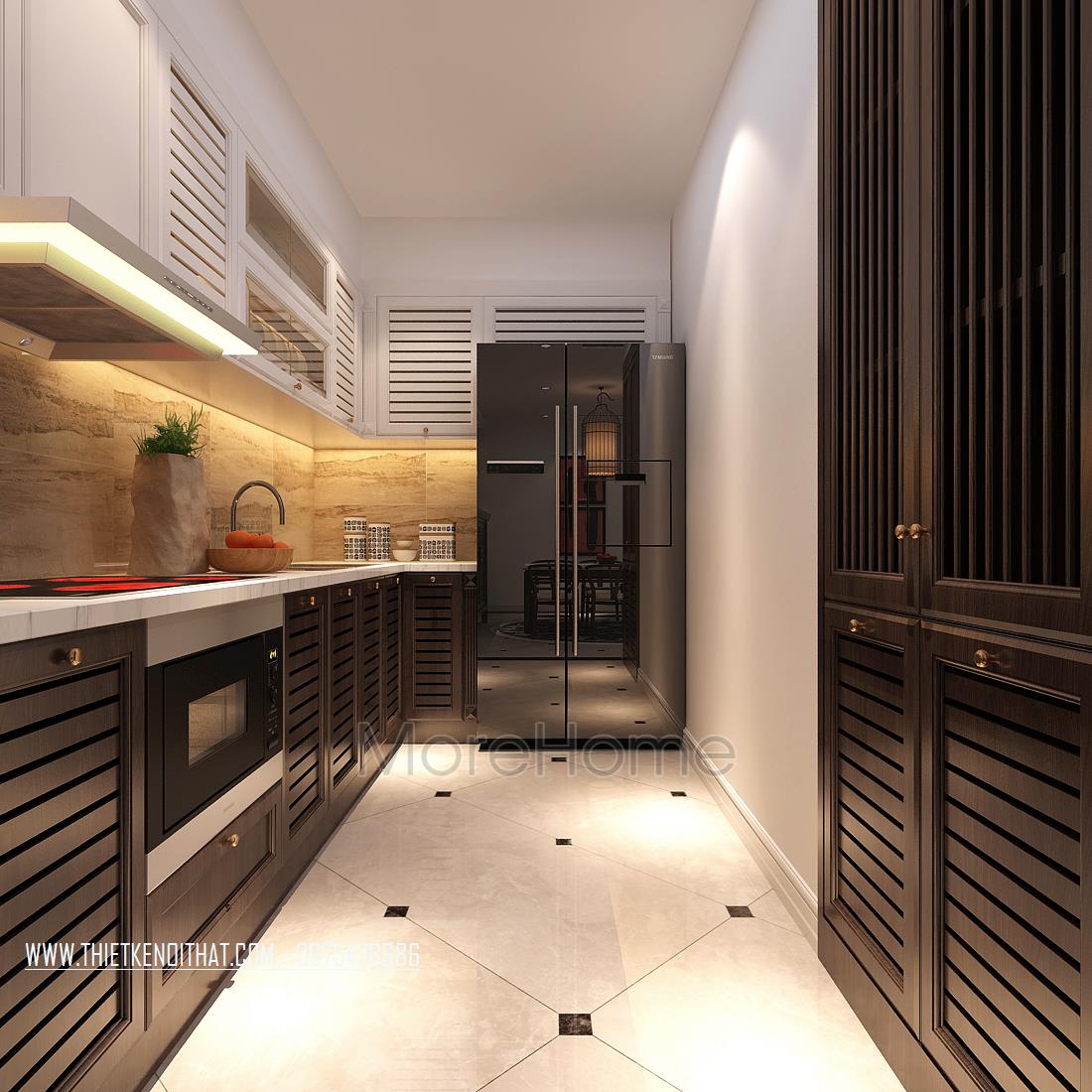 Cùng một không gian sinh hoạt chung bàn ăn được bố trí liền kề ngay cạnh đó với bộ bàn ghế gỗ tự nhiên với những đường cong cách điệu tinh tế, chỗ tựa ôm lưng khá thoải mái, ghế ăn có tay vịn. Phòng bếp được thiết kế lùi vào trong tách biệt với phòng khách và phòng ăn, hệ thống tủ bếp với tủ trên và tủ dưới máy hút mùi được lắp ngay trên bếp nấu đảm bảo không gian thông thoáng cho phòng bếp.