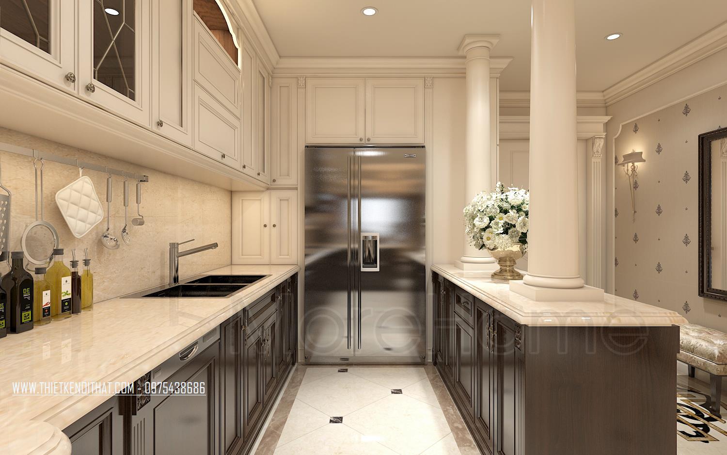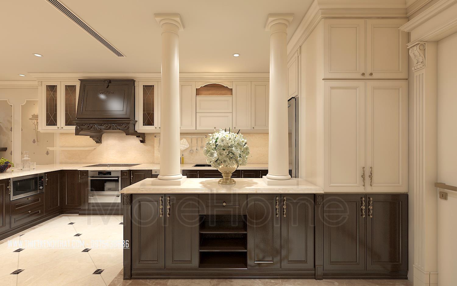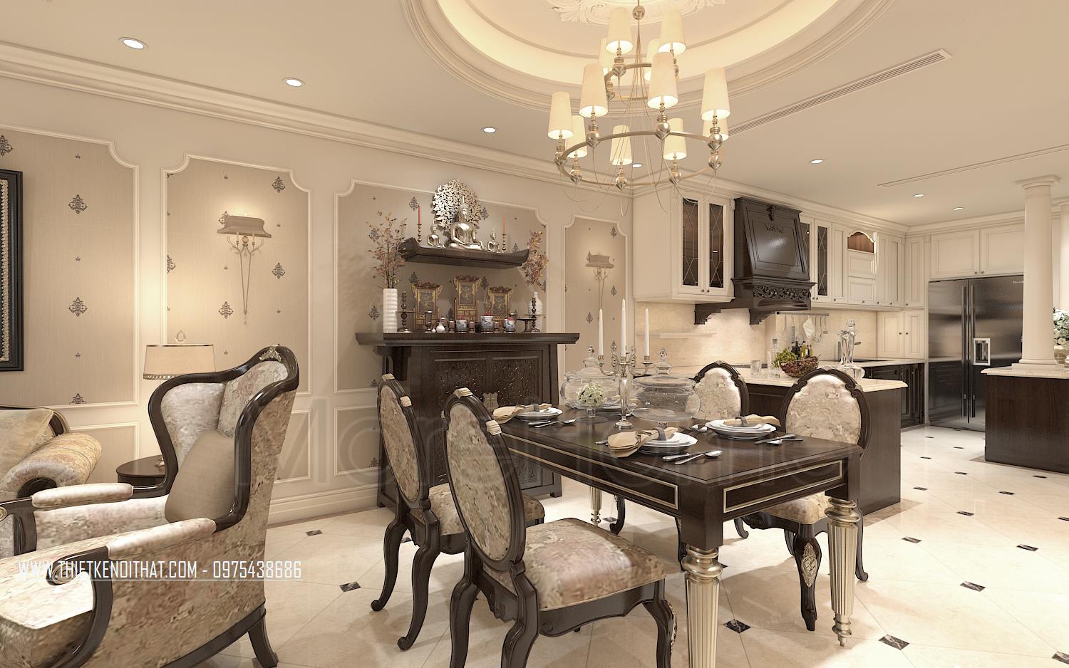 Đặt cạnh bàn ăn tân cổ điển, các kiến trúc sư khéo léo đưa bàn thờ đặt trang trọng ở vị trí giữa cạnh tường vừa để tạo bầu không khí ấm cúng các thành viên luôn được gần gũi bên tổ tiên trong mỗi bữa cơm gia đình vừa giúp tiết kiệm không gian trong căn nhà. Sang bên cạnh phòng ăn chính là phòng bếp với thiết kế các tủ bếp màu gỗ đồng màu với màu bàn ăn và bàn thờ giúp tạo sự kết nối rất tinh tế với cả căn nhà.