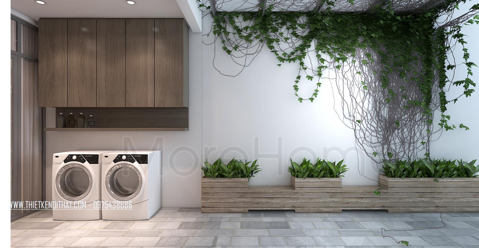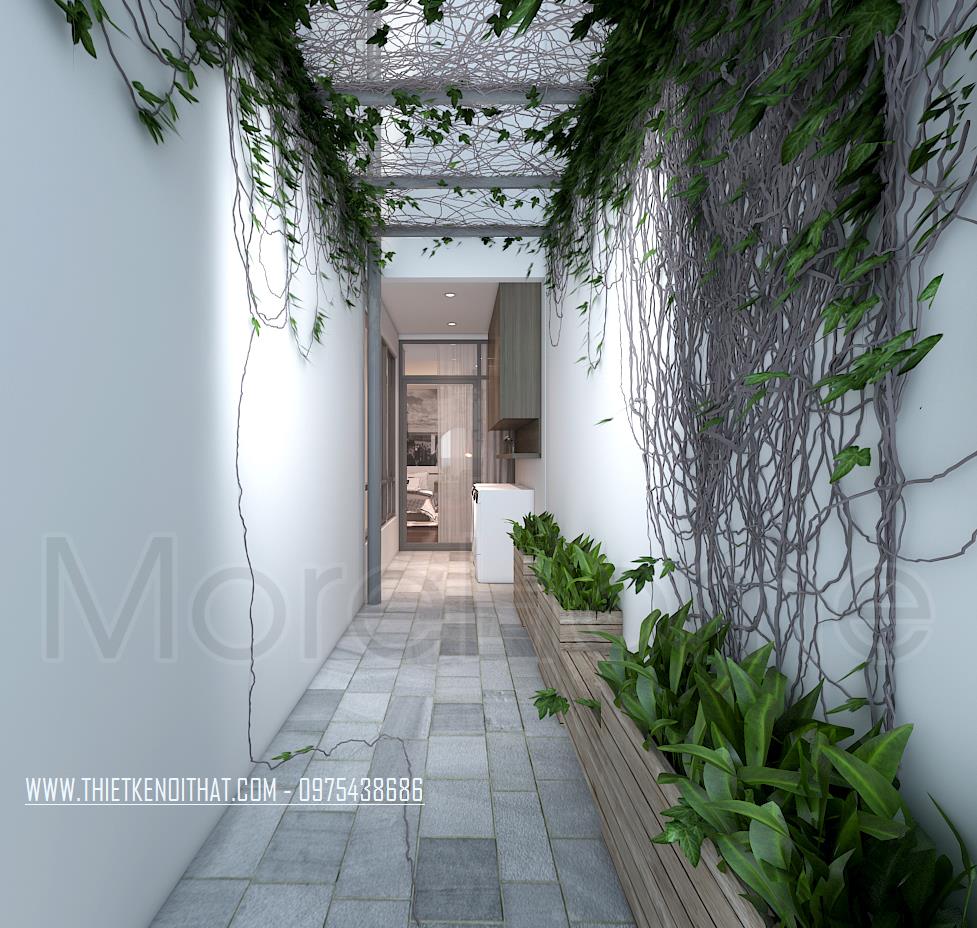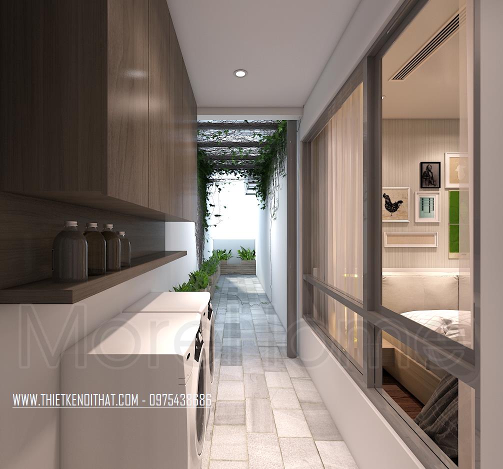 Với đoạn hành lang chạy dài từ phòng ngủ phong cách tân cổ điển đến ban công, các kiến trúc sư đã tư vấn gia chủ lựa chọn trồng các hàng cây xanh chạy dọc bên cạnh và treo giàn cây leo trên trần vừa thân thiện với thiên nhiên mang đến một màu xanh dịu mát cho đôi mắt thư giãn và kéo gần mọi người với mặt đất đồng thời lại tạo bóng râm mát cho căn nhà. Đồng thời thiết kế tân cổ điển sử dụng phong cách hiện đại nhấn nhá cho hành lang lại vừa tiết kiệm không gian bằng cách đặt các căn tủ và máy giặt bên ngoài hành lang.