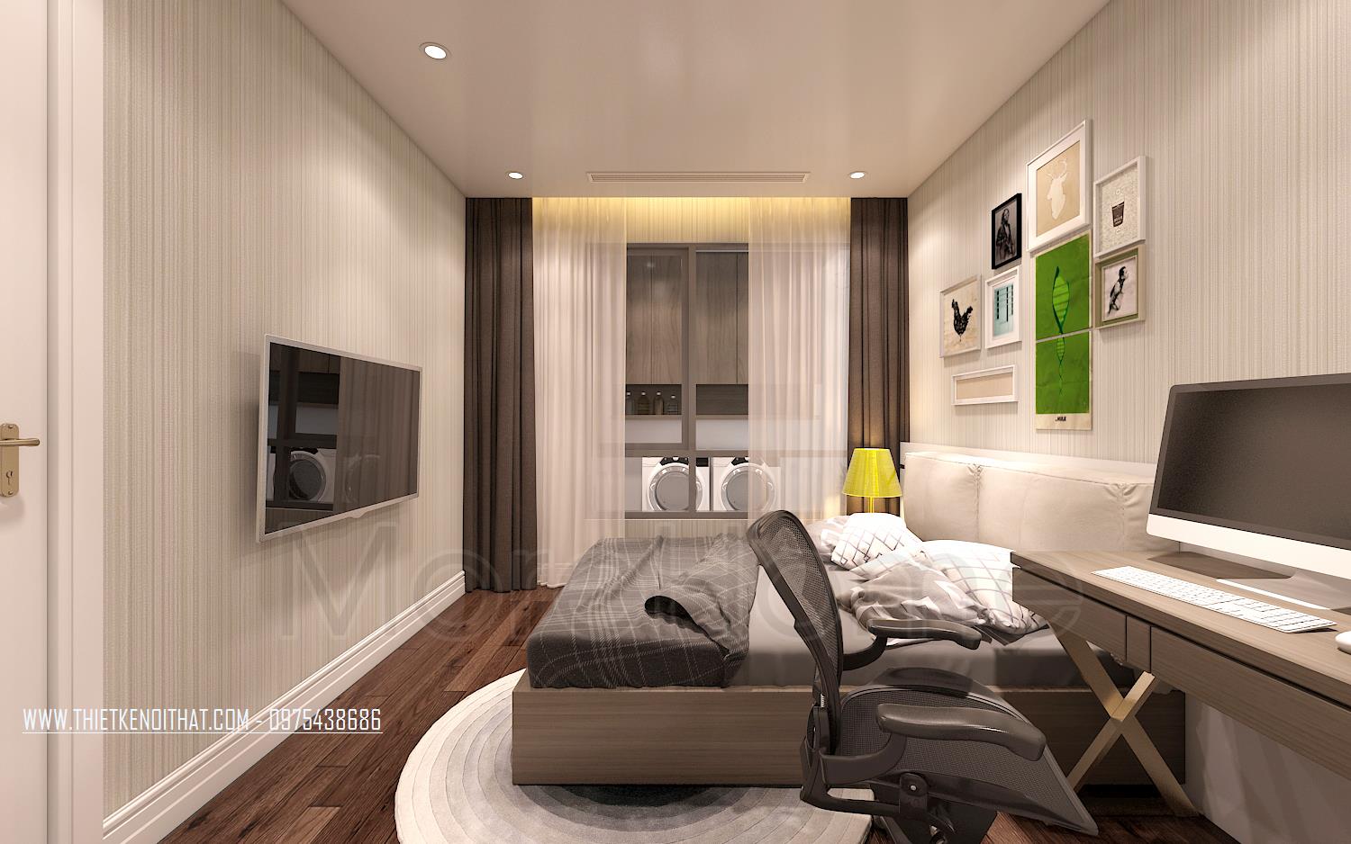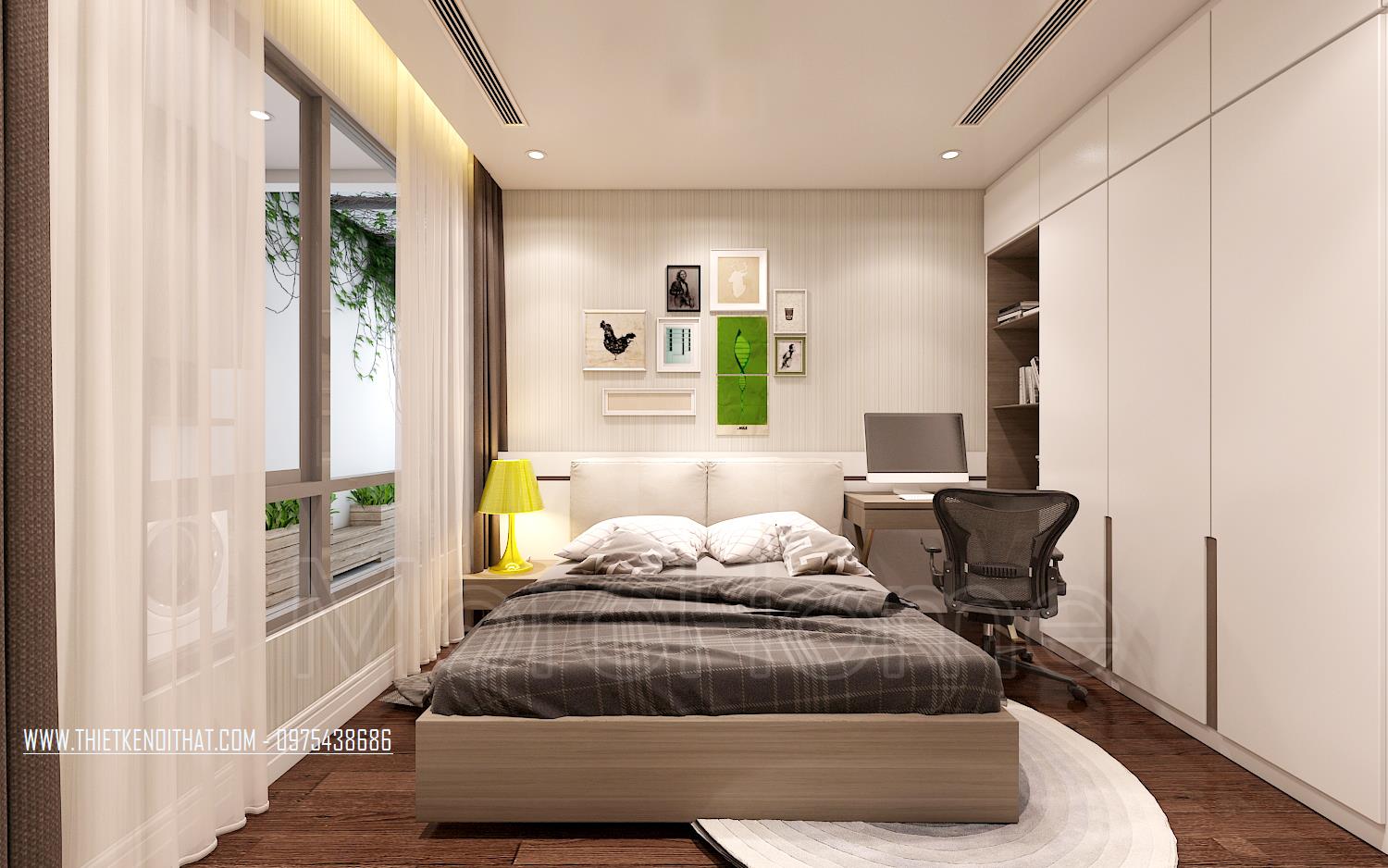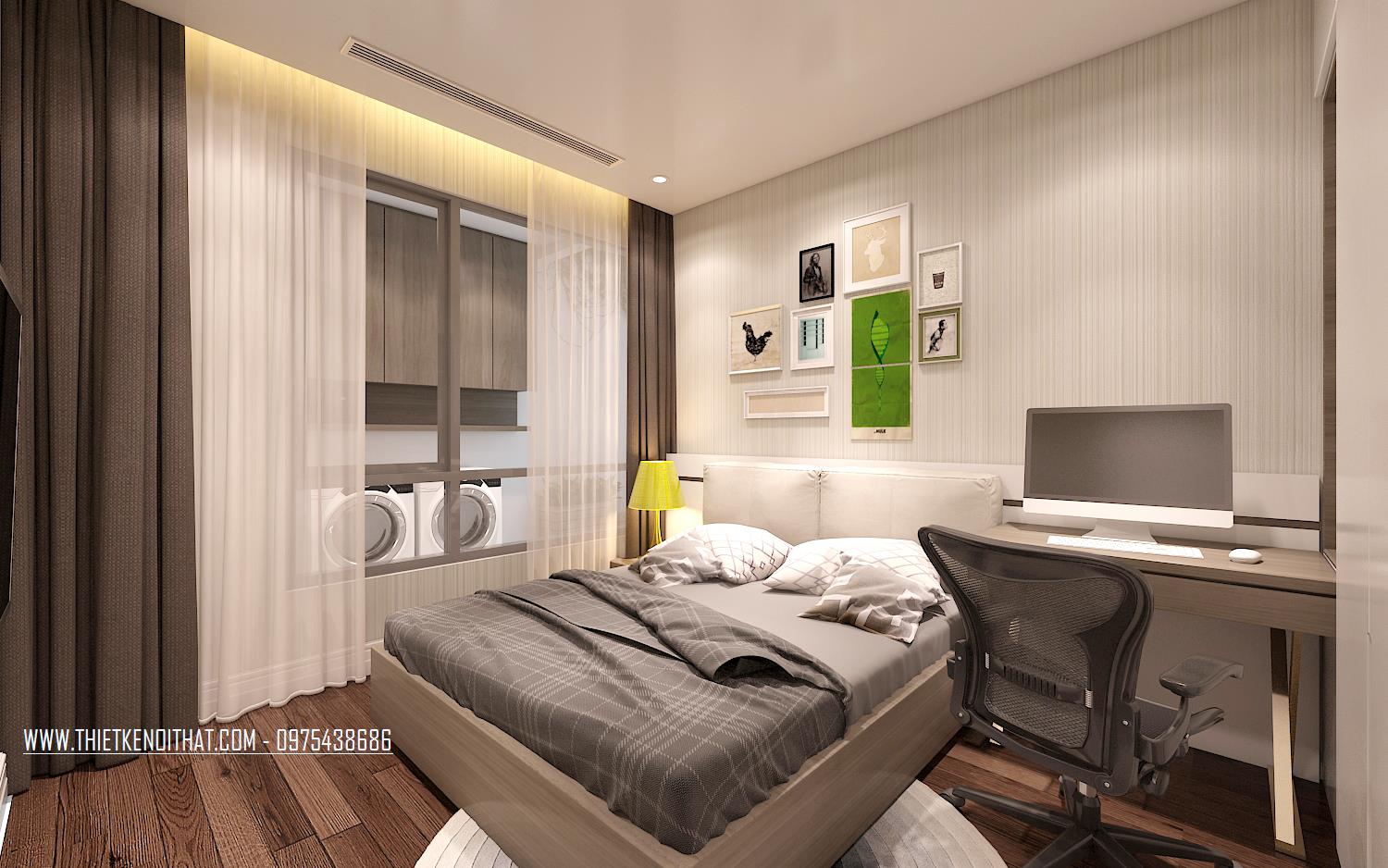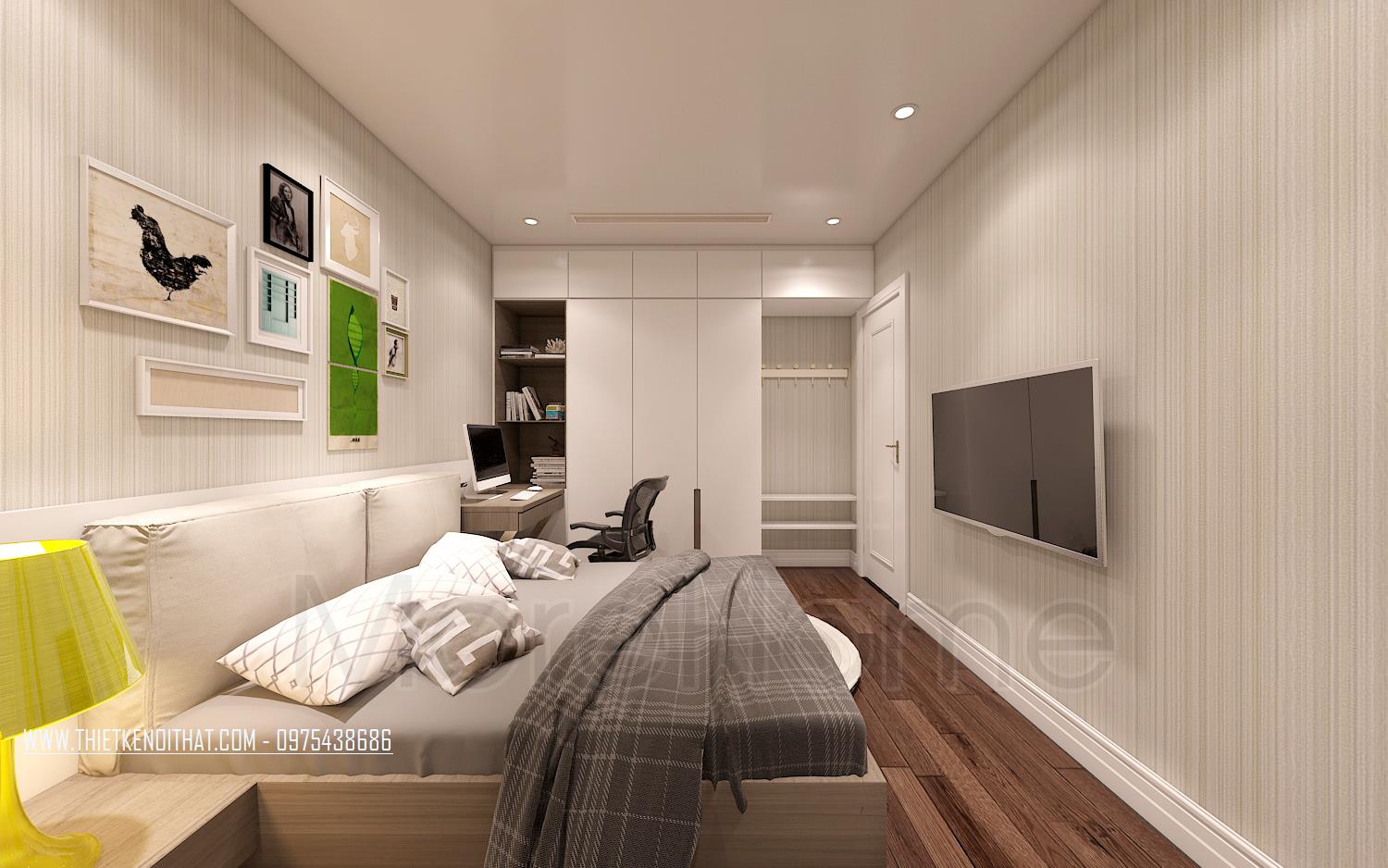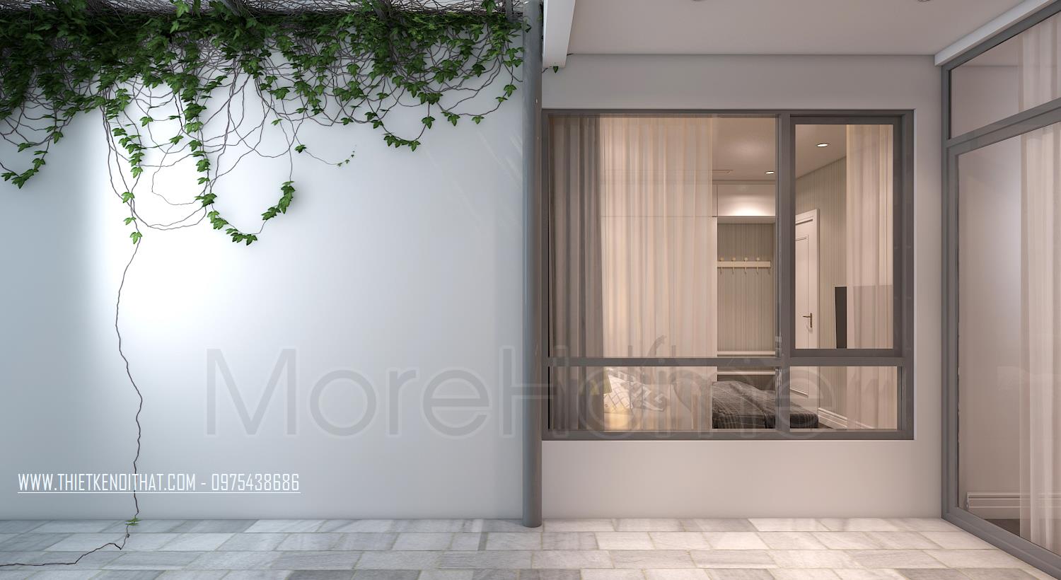 Bước sang căn phòng thứ hai, việc tận dụng cửa sổ ra ngoài hành lang để lấy ánh sáng tự nhiên đồng thời kéo rộng không gian cho phòng cũng là một điểm nhấn đáng lưu ý. Bên cạnh đó, thiết kế tủ âm tường màu trắng đồng màu với tường cũng giúp căn phòng trông vẫn thoáng đãng mà lại tiế kiệm diện tích. Tổng thể cả căn phòng tạo một sự nhẹ nhàng, tinh tế và mang một chất rất riêng.