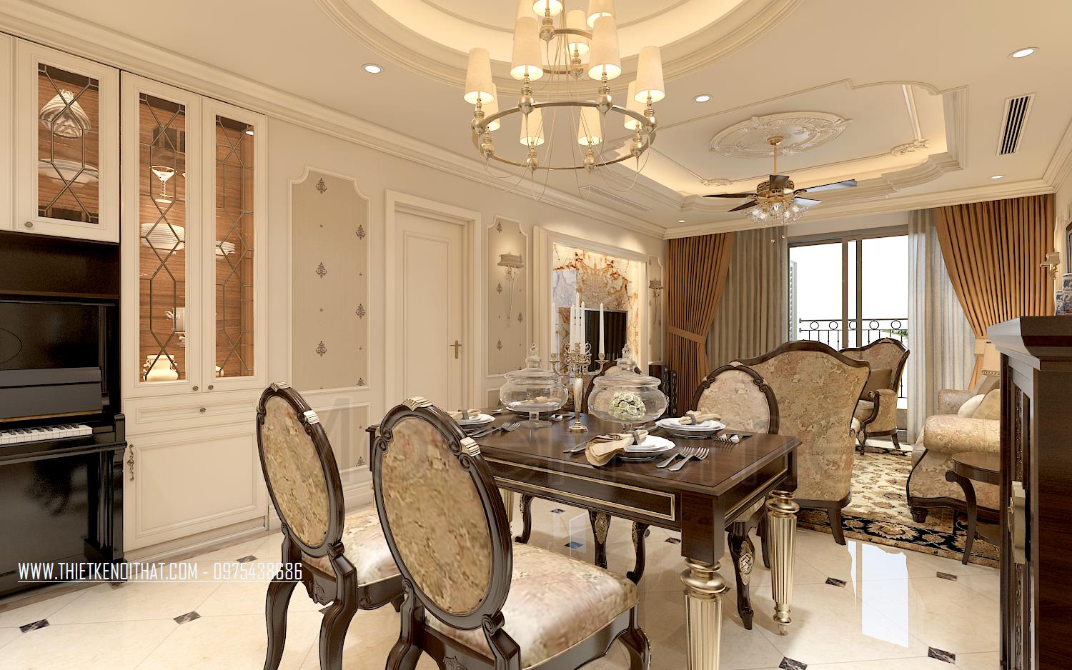 Liền kề phòng khách với phong cách tân cổ điển, đây là gian phòng ăn với bộ bàn gỗ tinh tế sang trọng là nơi để gia chủ cùng gia đình thưởng thức những bữa ăn ngon. Thiết kế bàn gỗ với chân bàn bằng nhôm với thiết kế cách điệu càng tăng thêm phần thanh cao và tinh tế cho căn phòng. Chiếc đàn piano cổ điển được đặt khéo léo bên cạnh phòng ăn với màu gỗ tương đồng với màu gỗ bàn ăn tạo sự đồng điệu và kết nối giữa các trang bị nội thất trong căn nhà.