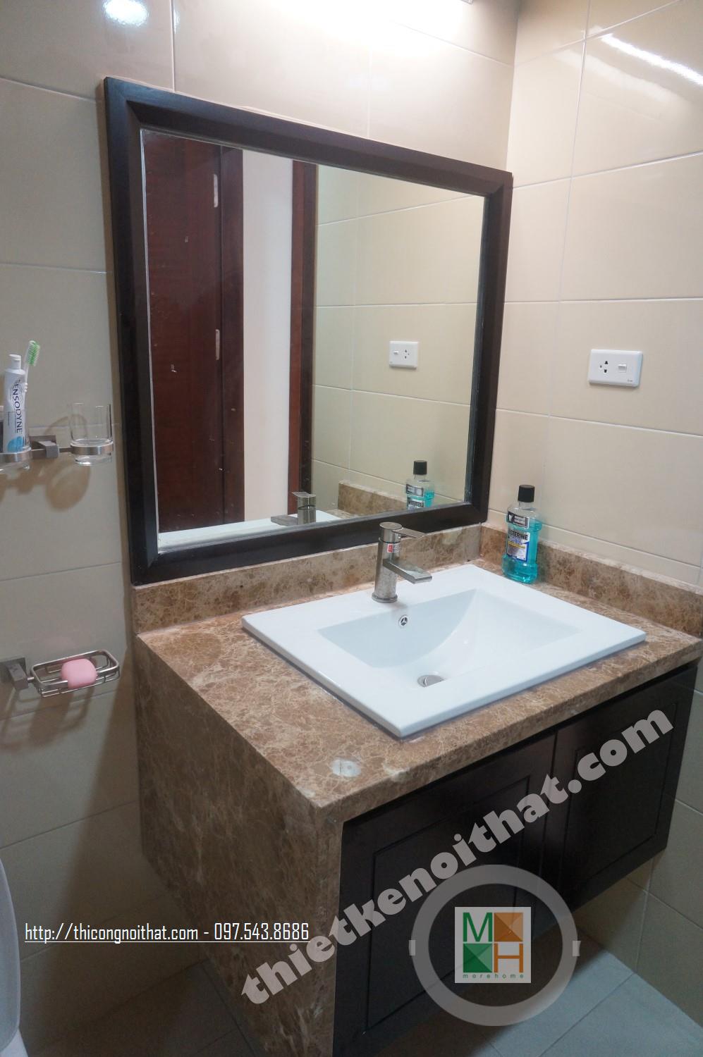 Thiết kế nội thất chung cư tại Meco Trường Chinh nhà chị Hằng thể hiện rõ sự gọn gàng, ngăn nắp với cách bài trí đồ đạc và phân chia không gian cực kì khoa học. Chính điều này đã góp phần không nhỏ tạo nên sự rộng rãi cho toàn bộ ngôi nhà và giữa các căn phòng. Đặc biệt trong phòng vệ sinh, sự hiện diện của tấm gương có độ lớn vừa phải đặt ngay trên bồn rửa khiến phòng tắm càng thêm rộng dù diện tích không hẳn là lớn.