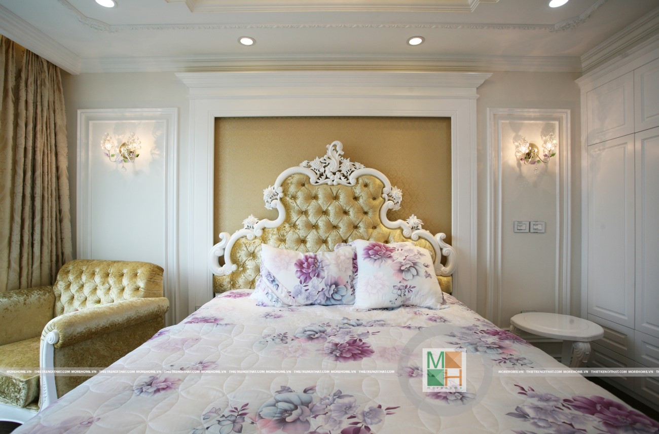 Phòng ngủ được thiết kế theo phong cách tân cổ điển thể hiện sự tinh tế, gọn gàng, các vật dụng trong căn phòng được sắp xếp hợp lý giúp cho không gian phòng trông thật gọn gàng và sáng sủa. Gam màu chủ đạo của căn phòng là màu trắng nhưng lại không làm cho căn phòng trở nên nhàm chán nhờ bộ giường ngủ kết hợp hoàn hảo từ màu sắc đến hoa văn họa tiết của chăn ga. Với hệ thống đèn treo tường màu vàng nhẹ giúp cho căn phòng càng trở nên ấm cúng hơn.
