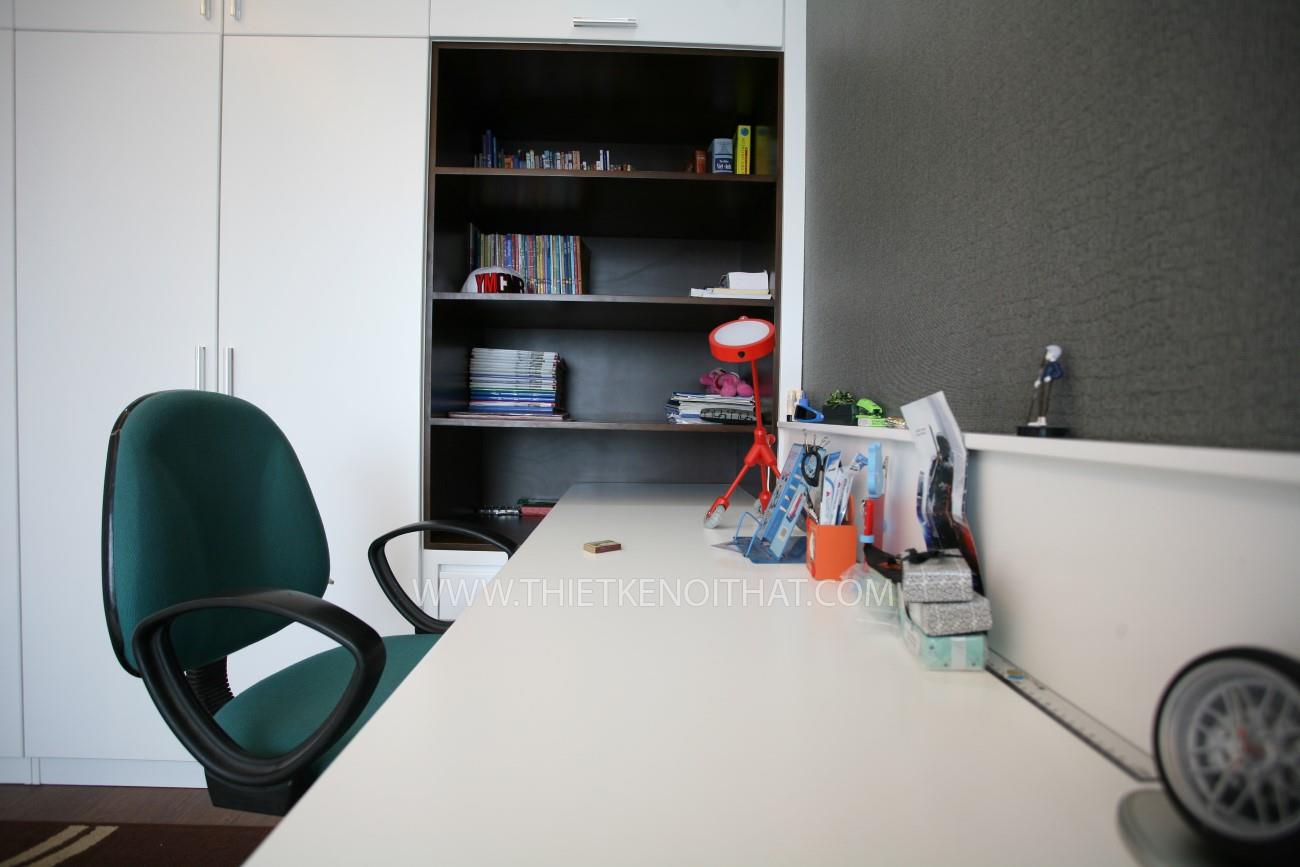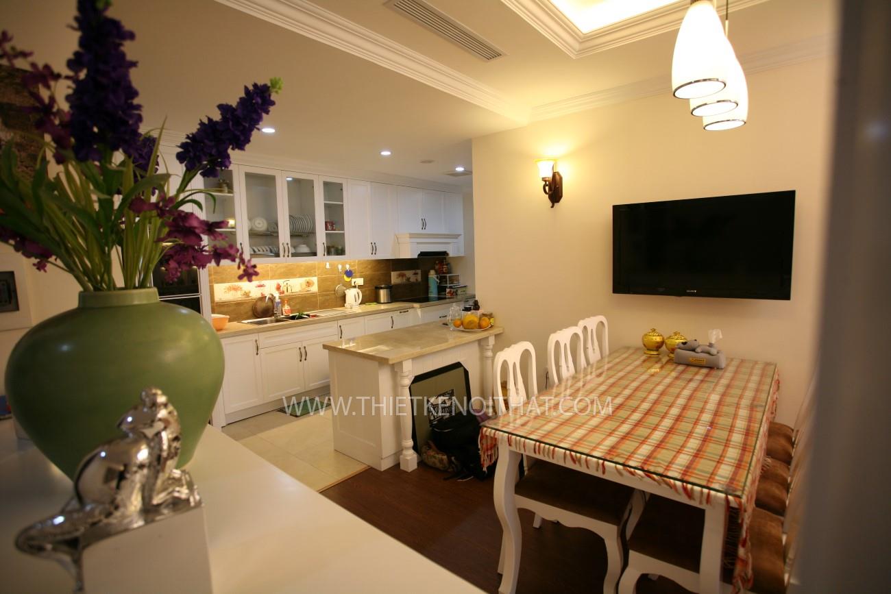 Nhà bếp độc lập được bố trí cạnh khu vực bàn ăn với đầy đủ công năng để đáp ứng tốt nhất nhu cầu sử dụng của chủ nhà. Với thiết kế nội thất phòng bếp thể hiện sự gọn gàng và thống nhất với tính hài hòa, hợp lí cao trong thói quen sử dụng của những chị em nội trợ.