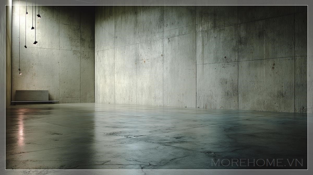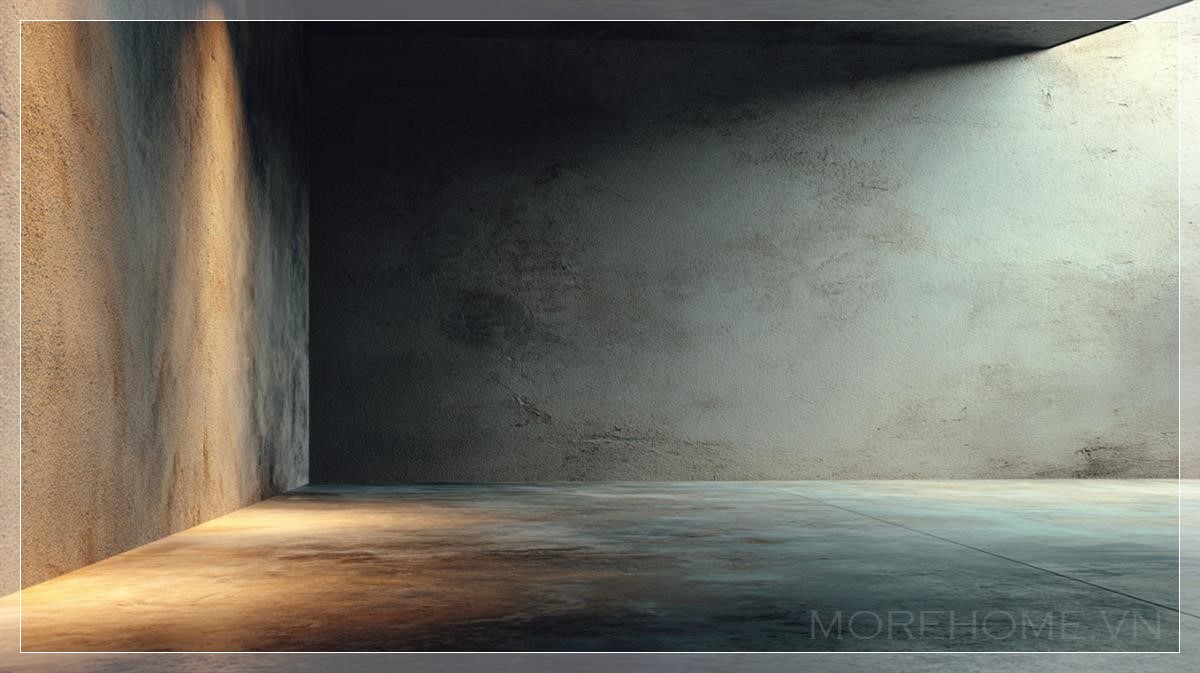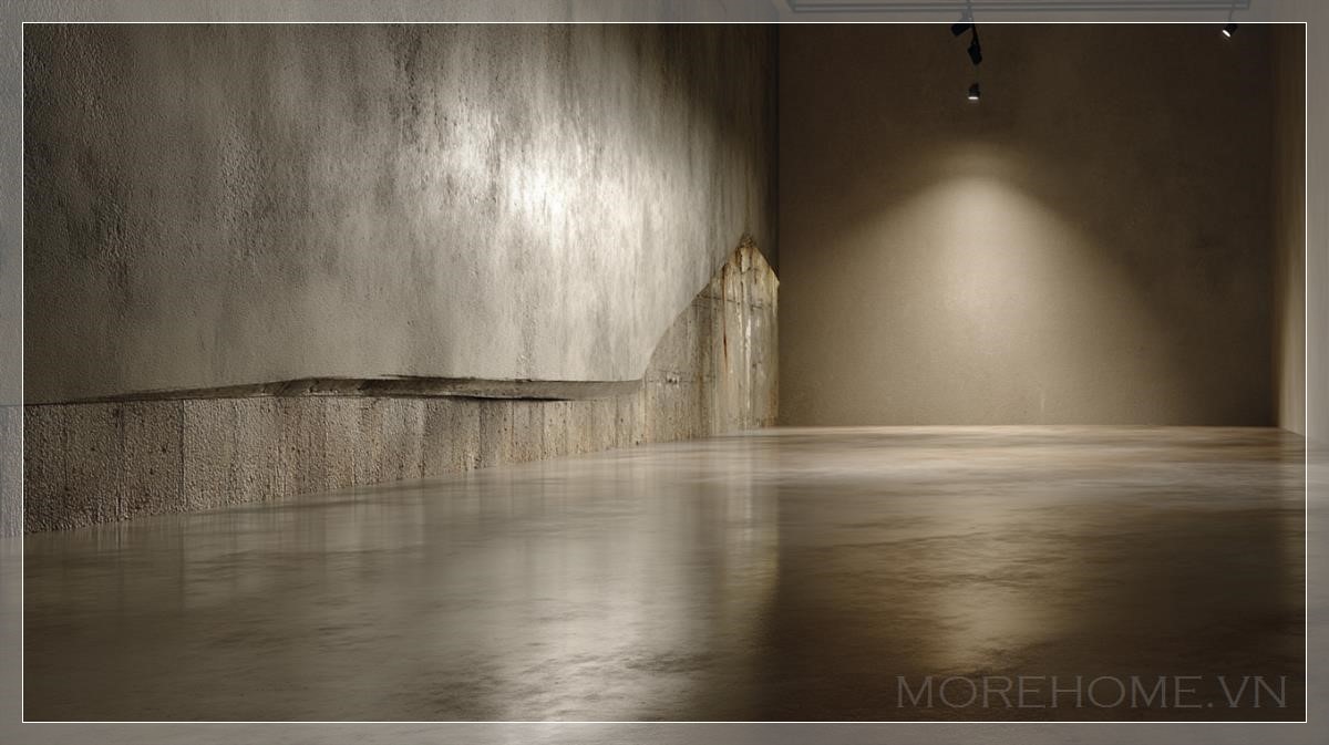 Một không gian được dựng lên bằng sự tối giản tuyệt đối, nơi nền bê tông thô hòa làm một với bức tường lớn không dấu vết, không trang trí, không sự hiện diện nào của con người hay vật thể. Ánh sáng công nghiệp mềm mại len lỏi từ phía xa, tạo nên những bóng mờ mỏng manh như hơi thở, đổ dài trên mặt sàn bụi nhẹ nhưng sạch sẽ, mang lại cảm giác của một buổi chiều không có thời gian.