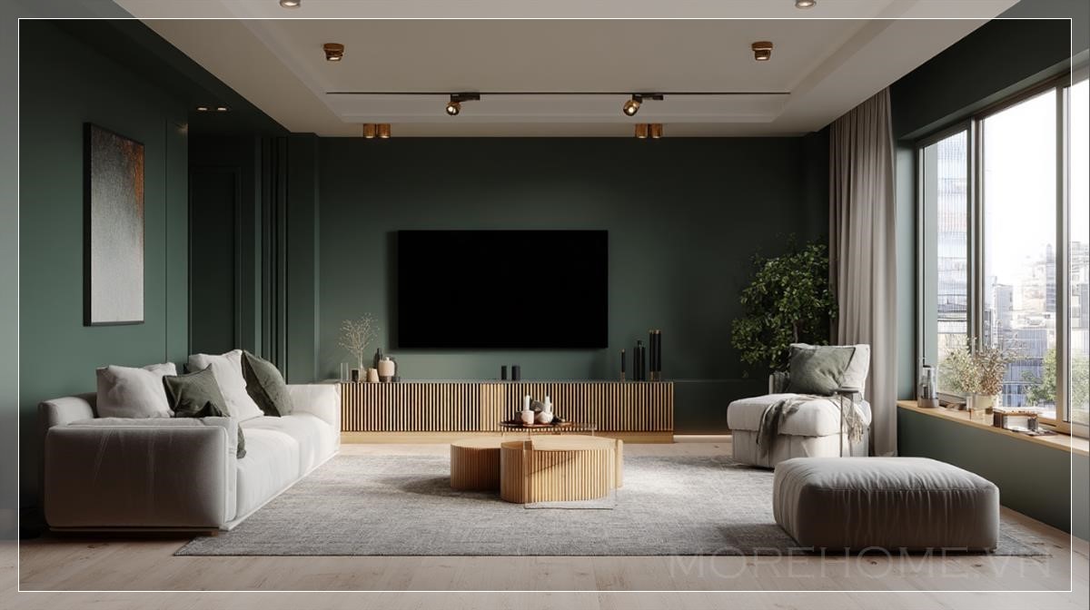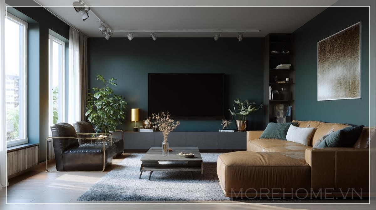 Trong không gian phòng khách này, tất cả đều được thiết kế xoay quanh một yếu tố nổi bật - chiếc TV lớn đặt chính giữa phòng. Mảng tường màu xanh đậm làm nền cho các món đồ nội thất, tạo nên một vẻ đẹp hiện đại, tối giản nhưng vô cùng sang trọng. Các món đồ nội thất được bài trí một cách cân đối, từ bộ ghế sofa thanh lịch cho đến các kệ tủ đơn giản, tất cả tạo thành một tổng thể thống nhất và hài hòa.
