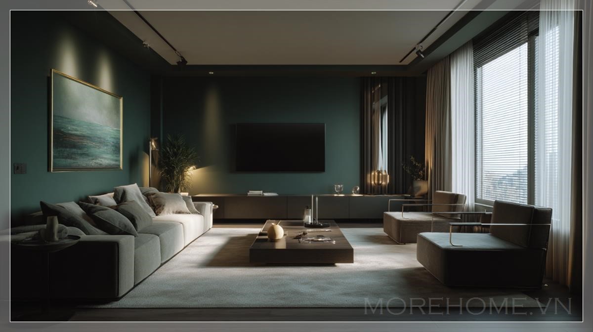 Ánh sáng chiếu từ các nguồn sáng mềm mại, tạo ra hiệu ứng điện ảnh với bóng đổ nhẹ nhàng trên các bức tường và đồ vật. Từng chi tiết được chăm chút kỹ lưỡng, từ màu sắc tường xanh tối đến chất liệu của các món đồ nội thất, tất cả hòa quyện vào nhau để tạo nên một không gian vừa tinh tế, vừa thư giãn. Góc nhìn ở mức mắt người giúp bạn cảm nhận được sự hoàn hảo trong cách bài trí: mọi thứ đều được sắp xếp đối xứng, mang lại sự cân bằng trong cảm giác.