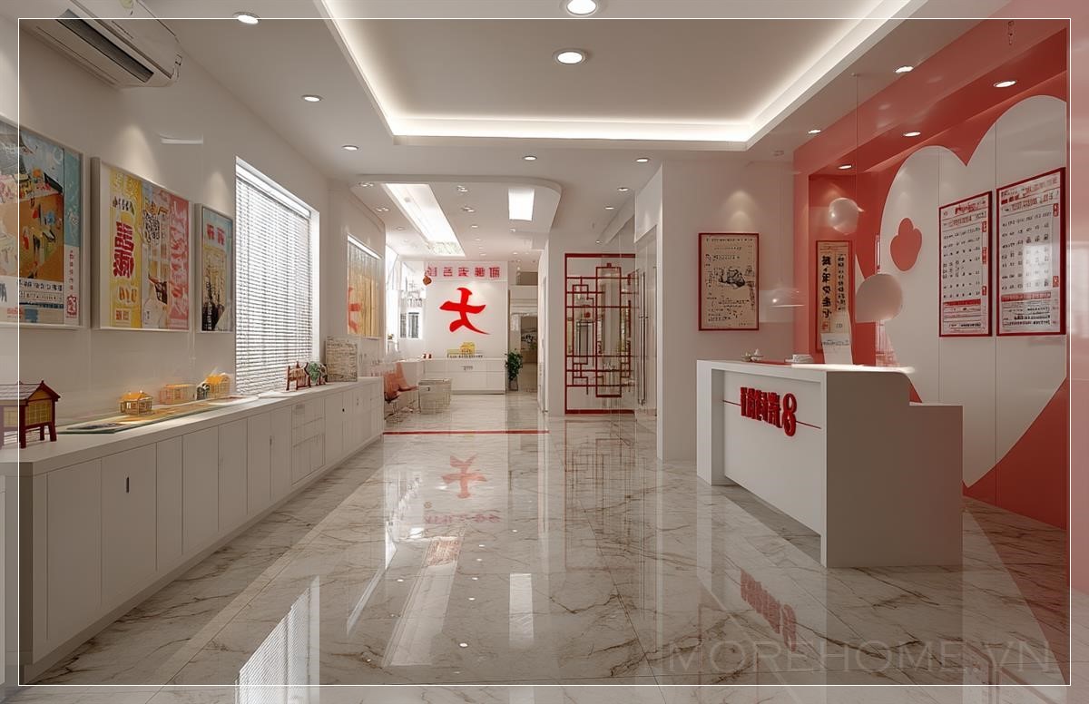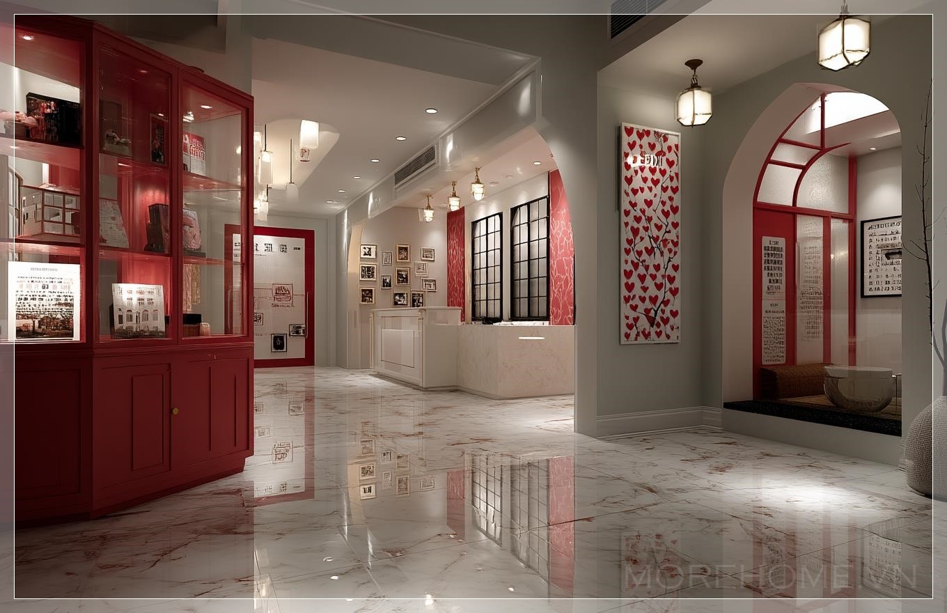 Ngay khi bước vào, ánh sáng ấm áp bao trùm, làm nổi bật những chi tiết tinh xảo của không gian. Những bức tường nhẹ nhàng khoác lên mình họa tiết hình trái tim, với sự kết hợp giữa tông màu xám nhạt và đỏ, tạo nên một không khí vừa nhẹ nhàng, vừa đầy cảm xúc. Màu sắc này không chỉ mang lại cảm giác gần gũi mà còn gợi lên một sự tôn trọng đối với những giá trị gia đình và tình yêu, một chủ đề không thể thiếu trong văn hóa Trung Hoa.