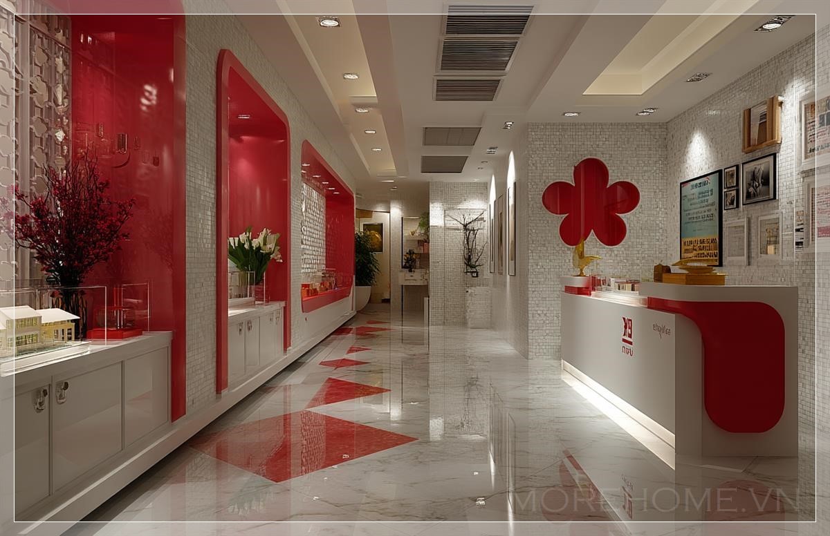 Ở góc phòng, quầy lễ tân nổi bật với thiết kế đơn giản nhưng không kém phần tinh tế. Mặt bàn được làm từ chất liệu gỗ cao cấp, được gia công cẩn thận, kết hợp với ánh đèn vàng ấm áp, khiến cho không gian này càng thêm phần thân thiện và dễ chịu. Đây là nơi mà những người đến tìm kiếm sự trợ giúp sẽ cảm nhận được sự chào đón nồng nhiệt và sự chuyên nghiệp trong mỗi chi tiết.