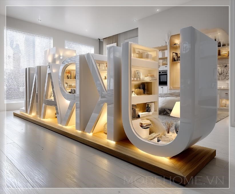 Cả ba lớp không gian này đều được mô phỏng tỉ mỉ, giúp chúng không chỉ đẹp mắt mà còn hoàn toàn phù hợp với hình dáng của từng chữ cái. Toàn bộ tác phẩm này nằm trên một nền gỗ mỏng, tạo cảm giác vững chãi và sang trọng, làm nổi bật sự tinh tế của thiết kế 3D. Đặc biệt, sự kết hợp giữa Cinema 4D và Octane Rendering mang đến một hiệu ứng ánh sáng sống động, khiến từng chi tiết, từ bóng đổ đến vật liệu, đều trở nên chân thực và sống động hơn bao giờ hết.