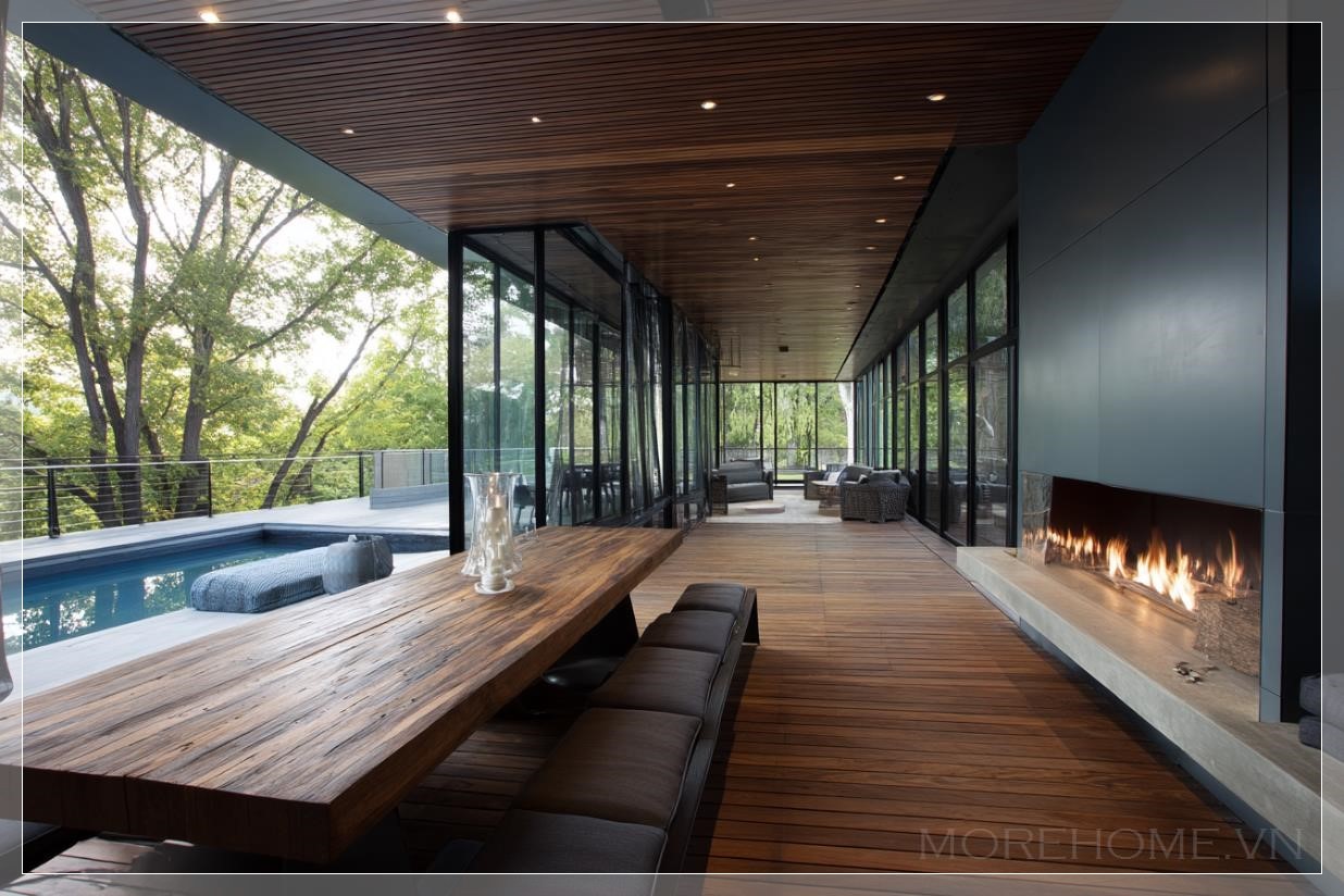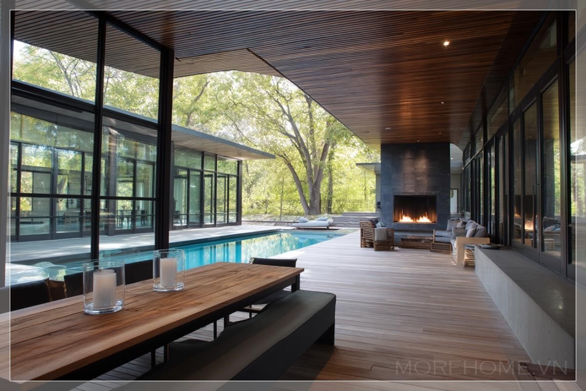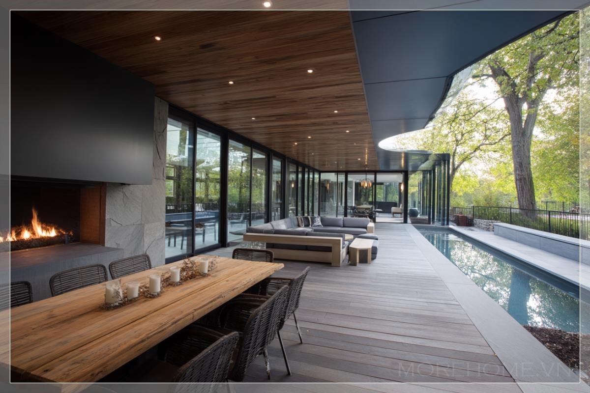 Sân hiên tối giản không chỉ là một không gian ngoài trời, mà còn là một nơi thể hiện sự kết hợp hoàn hảo giữa thiên nhiên và công nghệ. Với hồ bơi lấp lánh dưới ánh nắng, những cửa sổ lớn từ sàn đến trần, và một không gian mở mát mẻ, bạn có thể tận hưởng không gian sống đẳng cấp, thoải mái mà không mất đi vẻ đẹp thanh lịch của một ngôi nhà hiện đại. Cùng với một sự kết hợp giữa những chiếc ghế dài tối giản và các mảng gỗ tự nhiên, sân hiên trở thành một ốc đảo yên bình, lý tưởng cho việc thư giãn và tiếp khách.