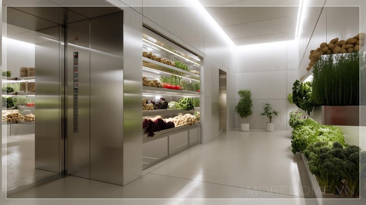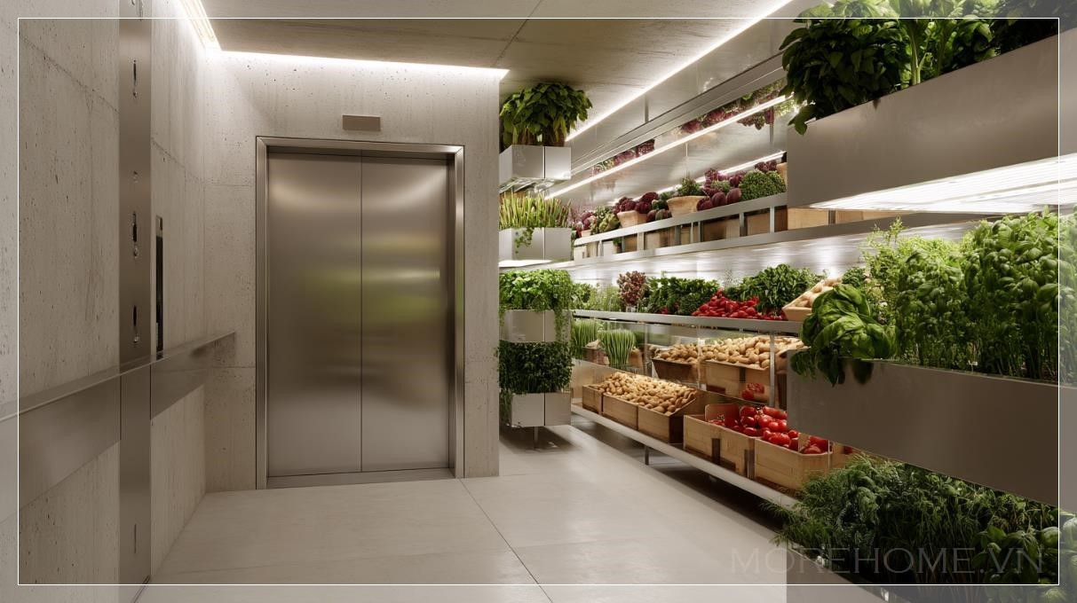 Trong không gian chật hẹp nhưng đầy sáng tạo, những cây trồng như khoai tây, cà chua và xà lách đang phát triển trong một môi trường đầy bất ngờ - một chiếc thang máy. Những bức tường xung quanh được làm từ bê tông trắng mờ, tạo nên một không gian tối giản nhưng đầy sức sống. Mỗi chi tiết, từ các ngóc ngách của những chiếc lá xanh tươi cho đến vẻ bóng loáng của thang máy bằng thép không gỉ, đều gợi lên sự hòa hợp giữa công nghệ và thiên nhiên.