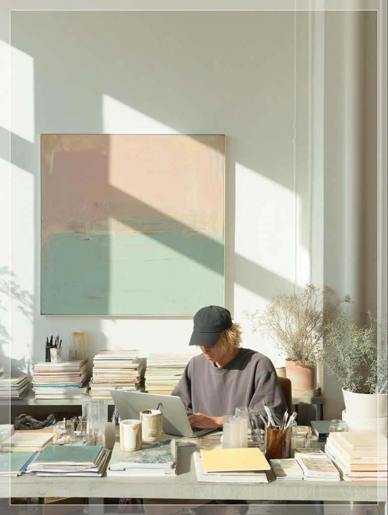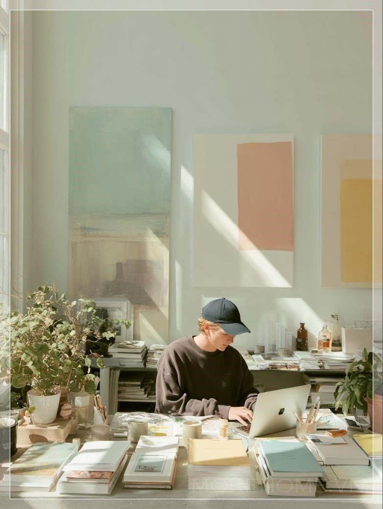 Người đàn ông ngồi tại chiếc bàn, đội chiếc mũ baseball đen, mặc chiếc áo sweatshirt rộng rãi, đang tập trung vào màn hình laptop. Cảm giác như anh đang hòa mình vào không gian yên tĩnh này, nơi những bóng đổ nhẹ nhàng từ ánh sáng mặt trời tạo thành những vệt chéo trên mặt bàn, khiến căn phòng như sống dậy với những chuyển động tinh tế.