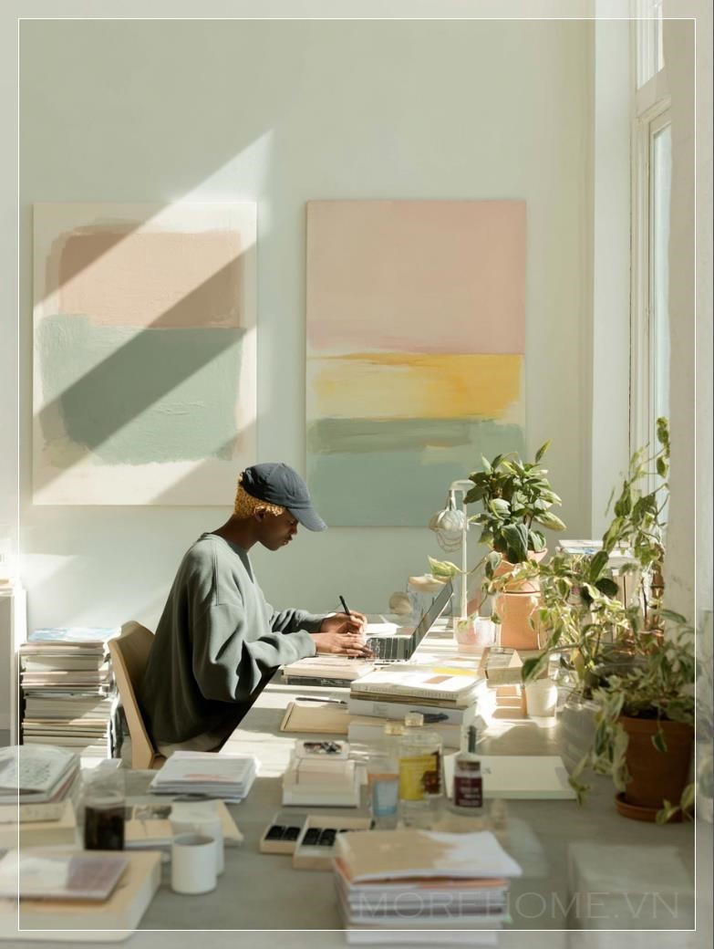 Với mỗi cú gõ bàn phím, không gian này không chỉ là nơi làm việc mà còn là nơi tiếp thêm cảm hứng sáng tạo. Ánh sáng tự nhiên càng làm nổi bật sự thoải mái, dễ chịu của không gian. Những bóng đổ mềm mại từ cửa sổ tạo nên một khung cảnh thư giãn, giúp tâm trí tỉnh táo và sáng suốt, sẵn sàng cho những dự án mới đầy thử thách.