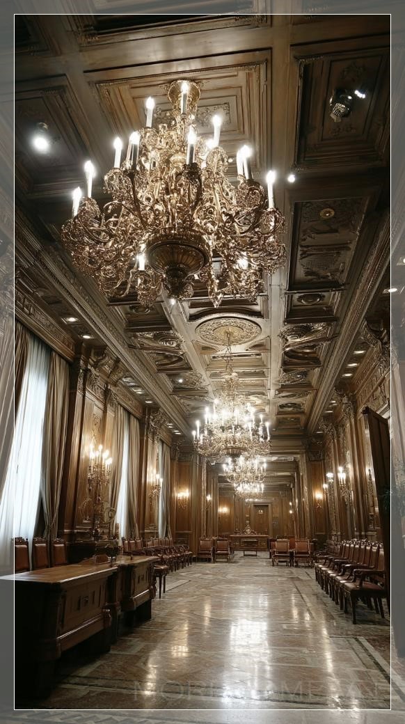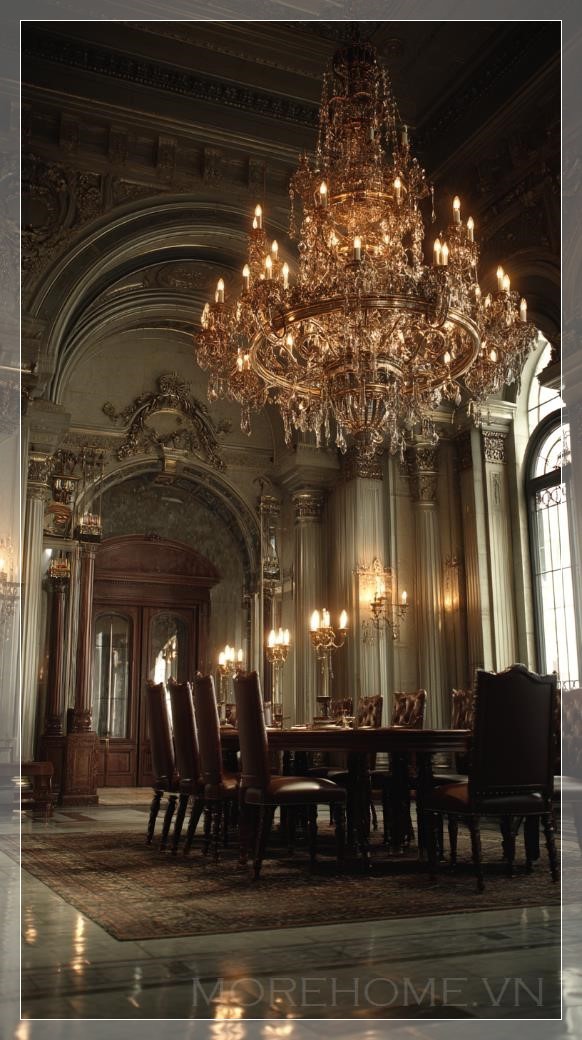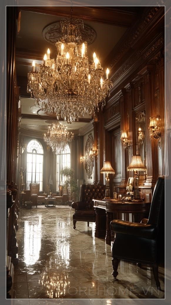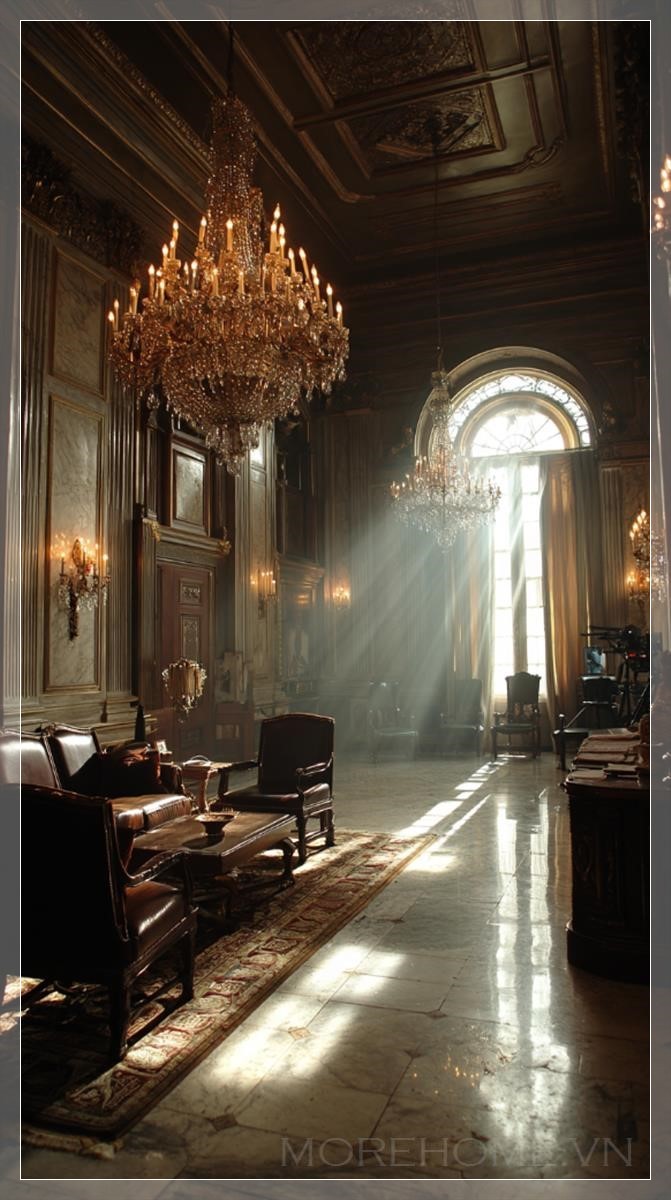 Ánh sáng từ đèn chùm, những bóng đèn thủy tinh lấp lánh treo từ trần cao, phản chiếu ánh sáng rực rỡ, mang đến một vẻ đẹp sang trọng không thể chối cãi. Mỗi tia sáng như là một vệt sáng khắc sâu vào không gian, vẽ nên một bức tranh kỳ diệu đầy ấn tượng. Những chi tiết kiến trúc tinh xảo trên tường, các bức tranh trang trí, và những bộ sofa nhung mượt mà tất cả hòa quyện vào nhau, tạo nên một không gian lịch lãm, đầy quyền lực nhưng không thiếu phần ấm áp.