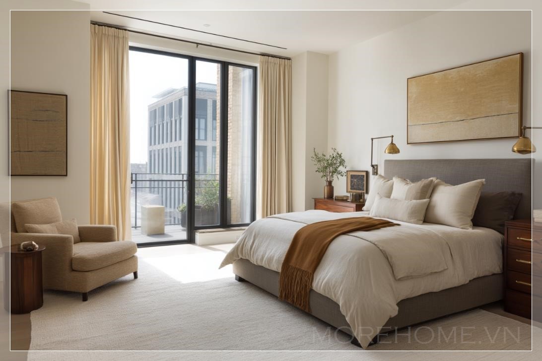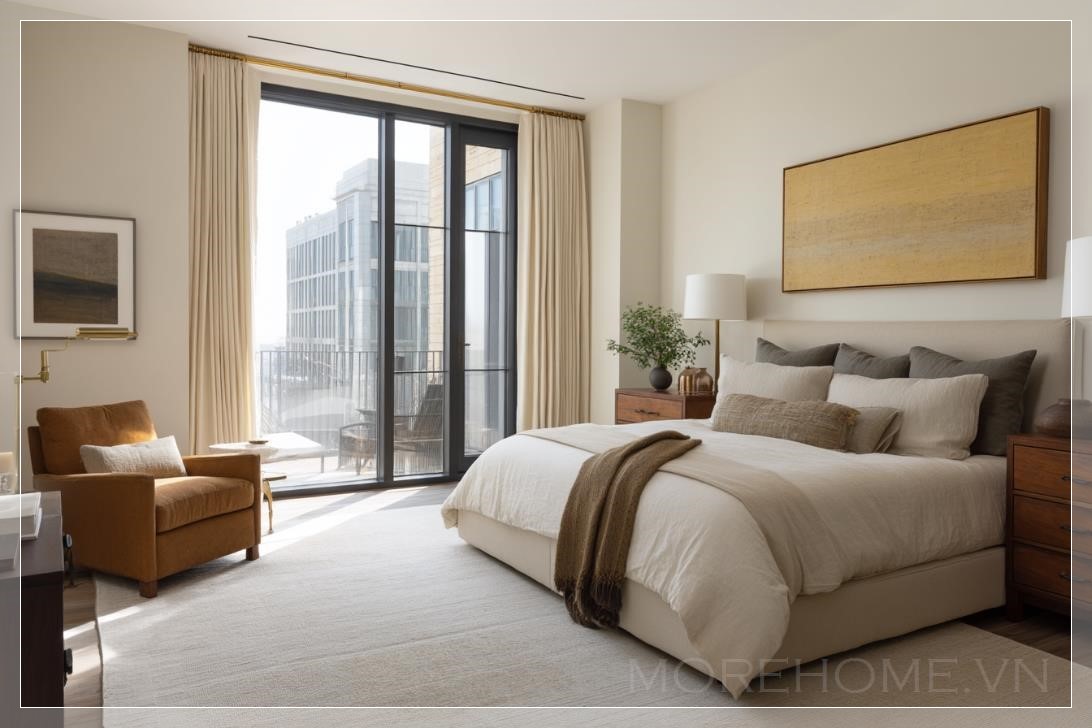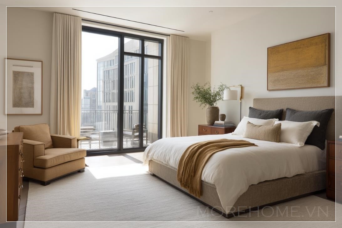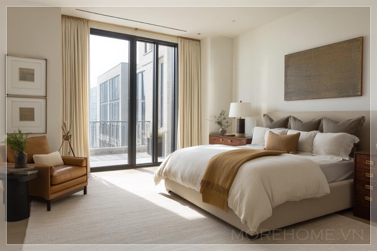 Điều đặc biệt của không gian này chính là ánh sáng tự nhiên rọi vào qua cửa sổ lớn, mở ra một ban công nhỏ xinh, nơi có thể tận hưởng một buổi sáng yên tĩnh, thư giãn. Bên cạnh giường là một chiếc tủ nhỏ với những ngăn kéo gọn gàng, vừa đủ để chứa đựng những vật dụng cần thiết mà không làm mất đi sự thanh thoát của không gian.