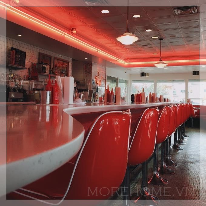 Những chiếc ghế bar màu đỏ, với thiết kế đơn giản nhưng đầy cá tính, không chỉ tạo điểm nhấn mạnh mẽ mà còn mang lại cảm giác thoải mái cho bất kỳ ai ngồi. Được đặt trước quầy bar, nơi những ly rượu và cocktail sặc sỡ luôn sẵn sàng, không gian này chính là hiện thân của sự pha trộn giữa quá khứ và hiện tại, giữa sự cổ điển và sự mới mẻ.