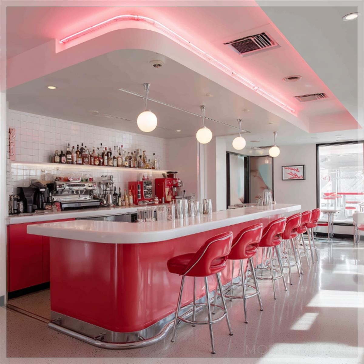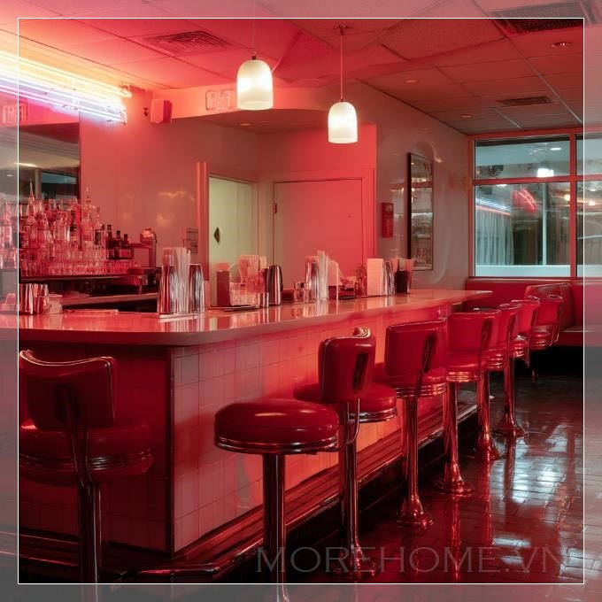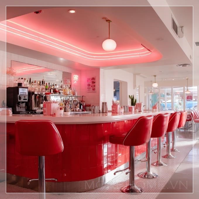 Chắc chắn sẽ có một sự hấp dẫn đặc biệt trong không gian này, nơi những chiếc ghế bar màu đỏ nổi bật cùng những ly cocktail cổ điển được bày biện gọn gàng trước quầy bar đỏ sáng bóng. Với ánh sáng neon ấm áp phản chiếu từ những đường nét mềm mại của quầy, không gian như bừng sáng lên, mang lại cảm giác sôi động và đầy sức sống. Trên nền trần nhà trắng tinh khôi, những đốm sáng neon càng thêm phần quyến rũ, khiến không gian này trở thành nơi lý tưởng để nhâm nhi những thức uống đầy phong cách.