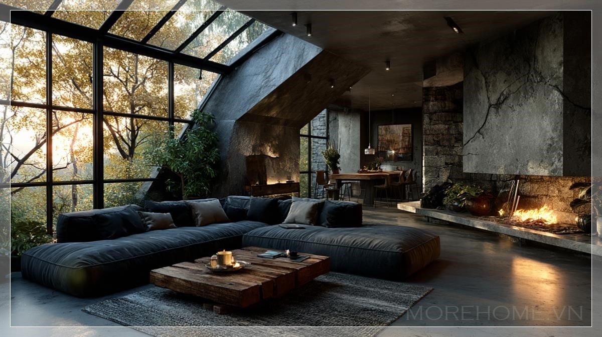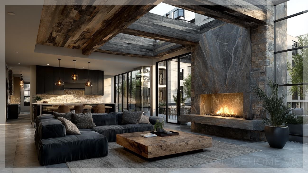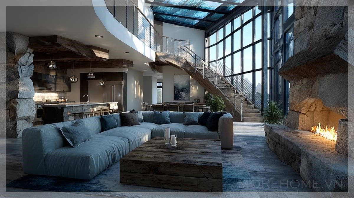 Ánh sáng tự nhiên tràn ngập qua các cửa sổ lớn, tạo ra những tia sáng lung linh phản chiếu trên bề mặt của các vật liệu cao cấp như đá marble và gỗ tự nhiên. Ánh sáng nhẹ nhàng chiếu lên từng góc nhỏ trong căn phòng, làm nổi bật những chi tiết thiết kế tinh xảo như chiếc đèn chùm kim loại treo giữa trần nhà cao, hay những bức tranh trang trí đơn giản nhưng đầy nghệ thuật treo trên các bức tường.
