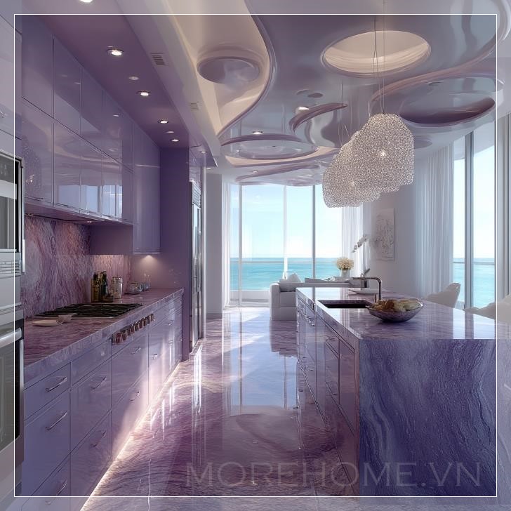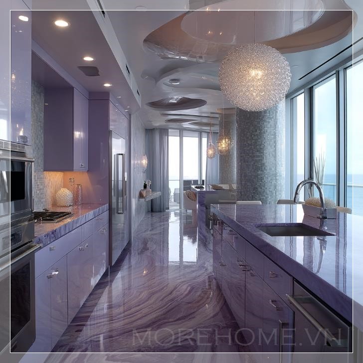 Được bao phủ bởi những sắc tím và oải hương quyến rũ, căn bếp này mang đến một không gian hoàn toàn hiện đại và đầy sang trọng. Mặt bàn bếp bằng đá cẩm thạch bóng loáng, với những đường vân trắng và tím nhạt uốn lượn, tạo thành một hiệu ứng mềm mại, gần như huyền bí, kéo dài liền mạch vào sàn nhà. Màu sắc này không chỉ nâng tầm không gian mà còn mang đến một vẻ đẹp huyền ảo, khiến người ta cảm thấy như đang bước vào một giấc mơ.