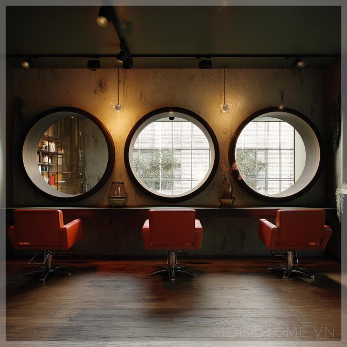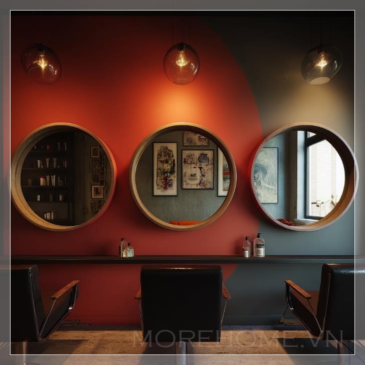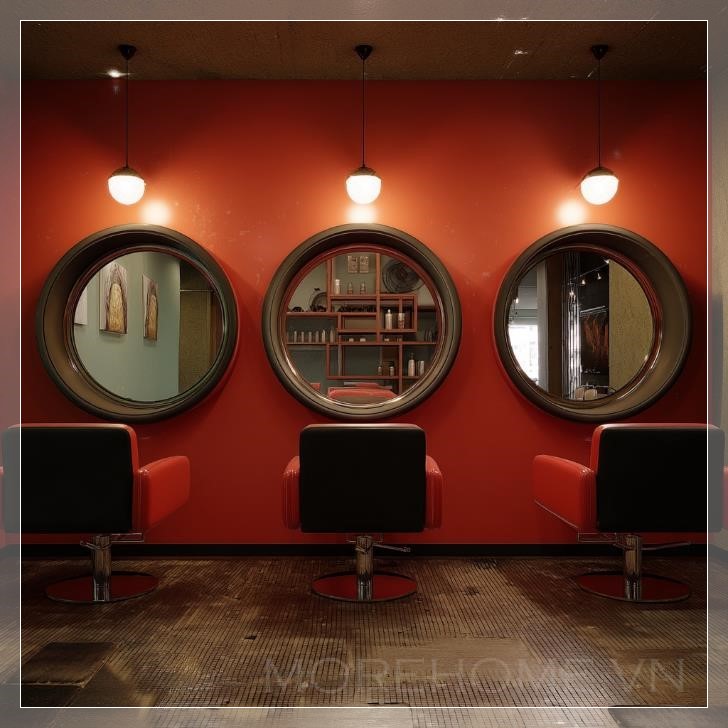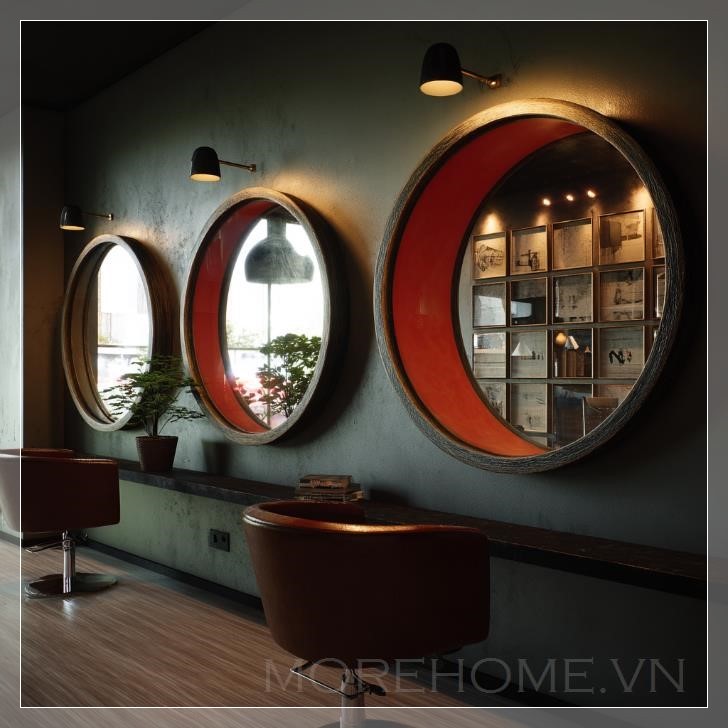 Trong một góc salon tóc, ba chiếc gương tròn được treo trên tường, mỗi chiếc phản chiếu một phần không gian độc đáo của căn phòng. Ánh sáng tự nhiên chiếu qua cửa sổ lớn, tạo nên những phản chiếu mềm mại trên mặt kính gương, khiến không gian như bừng sáng. Các gương được bố trí đối diện nhau, tạo ra một chiều sâu vô hình, như một sự kết nối giữa các không gian trong salon.