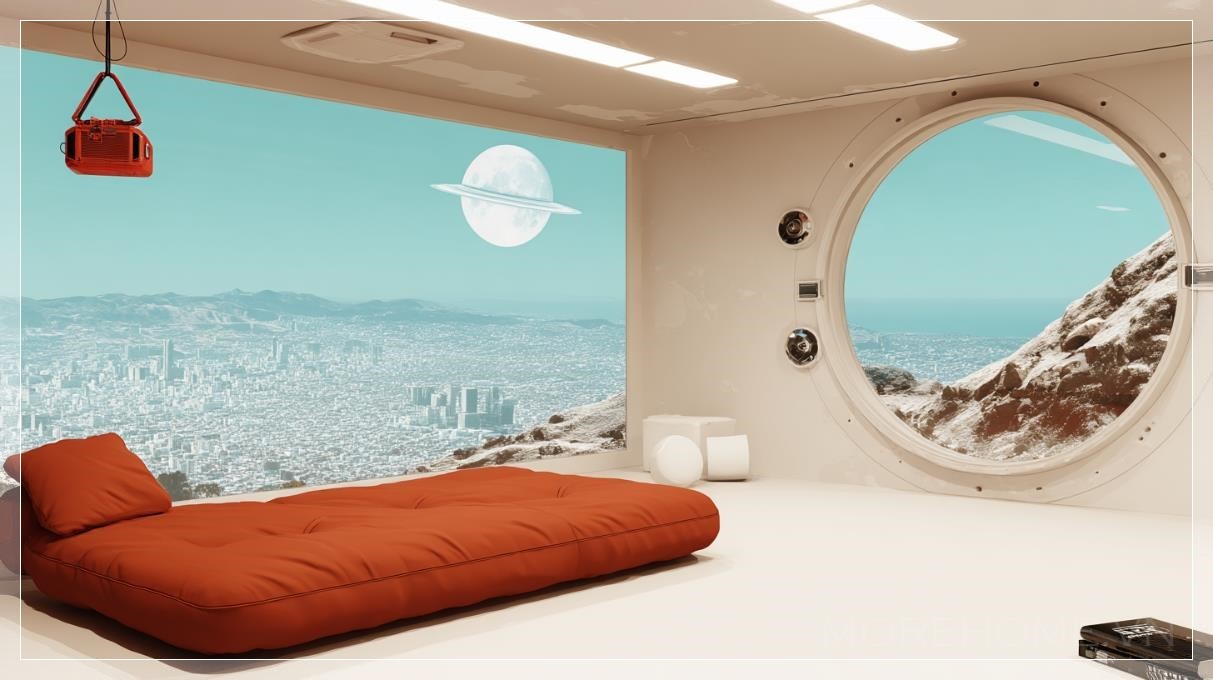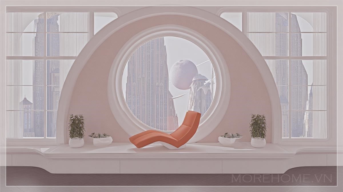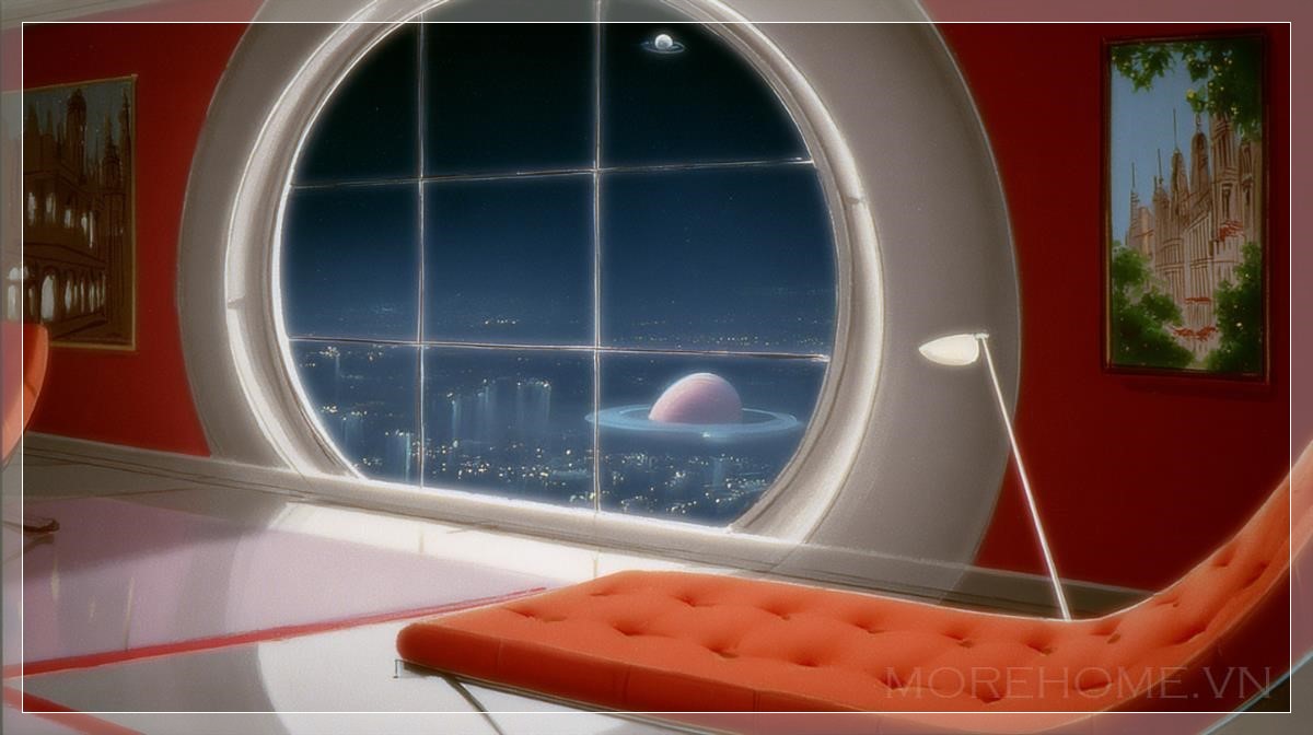 Không gian căn hộ retro-futuristic là một điểm đến độc đáo, nơi thiết kế hiện đại của tương lai gặp gỡ vẻ đẹp hoài cổ của những năm 1960. Với cửa sổ tròn khổng lồ, cảnh quan ngoài trời như một thành phố sci-fi xa xôi, nơi những tòa nhà cao chọc trời hòa vào bầu trời đêm tĩnh lặng, được tô điểm bởi một hành tinh có vành bao quanh, tạo nên một khung cảnh vũ trụ kỳ bí. Cửa sổ lớn này không chỉ mang lại ánh sáng tự nhiên mà còn mở rộng không gian, khiến căn phòng trở nên rộng rãi và thoáng đãng hơn bao giờ hết.