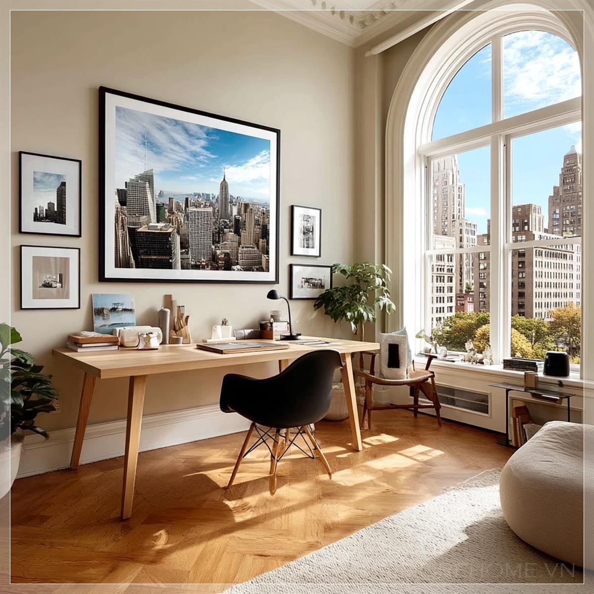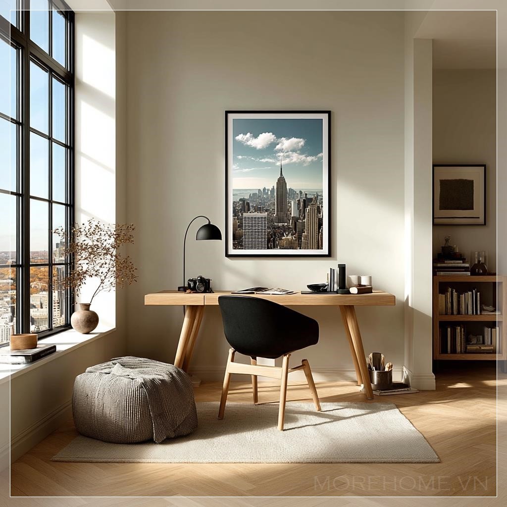 Chất liệu gỗ tự nhiên của sàn nhà, với các vân gỗ nhẹ nhàng, góp phần làm mềm mại không gian, đồng thời tạo nên cảm giác gần gũi với thiên nhiên. Cạnh chiếc bàn là một chiếc ghế văn phòng tối giản, màu đen mờ, được đặt xa hơn một chút so với đường tranh, mang đến một sự cân bằng hoàn hảo cho không gian. Đèn chiếu sáng nhẹ nhàng, không quá chói, giữ cho không gian luôn ở trạng thái bình yên nhưng đầy cảm hứng sáng tạo.