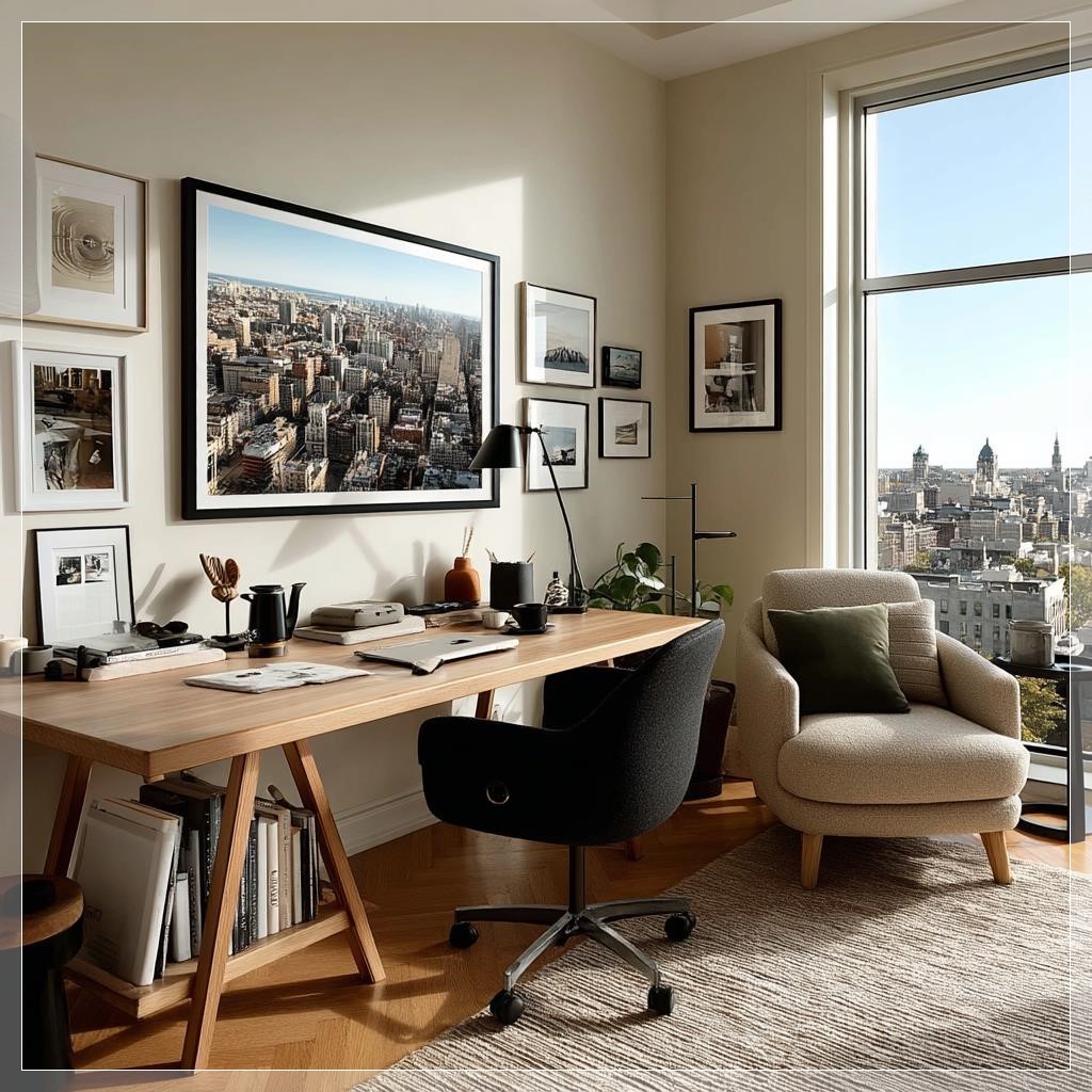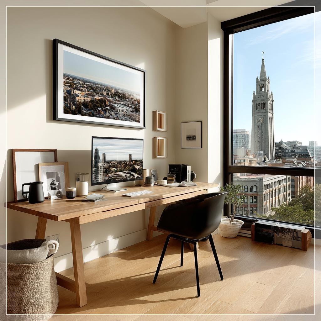 Trong một không gian văn phòng hiện đại, ánh sáng nhẹ nhàng lan tỏa khắp căn phòng với bức tường trắng mờ tạo nên một nền tảng thanh thoát, tinh tế. Ở chính giữa căn phòng là một chiếc bàn làm việc gỗ óc chó bóng mượt, với thiết kế đơn giản, nhưng đầy sang trọng. Trên tường, một bức tranh khổ ngang khung đen, với hình ảnh một thành phố đô thị, được treo thẳng hàng, không chút nghiêng, tạo điểm nhấn mạnh mẽ nhưng không gây áp lực lên không gian xung quanh.