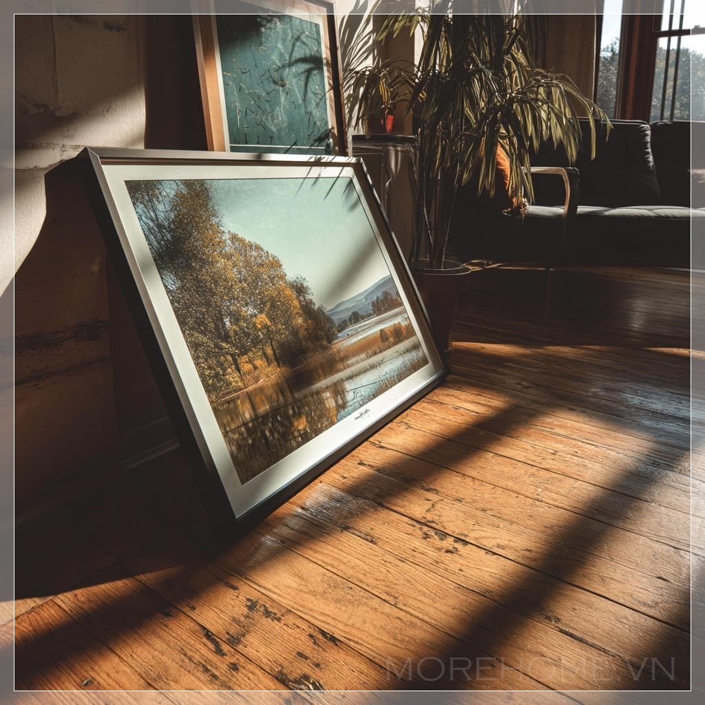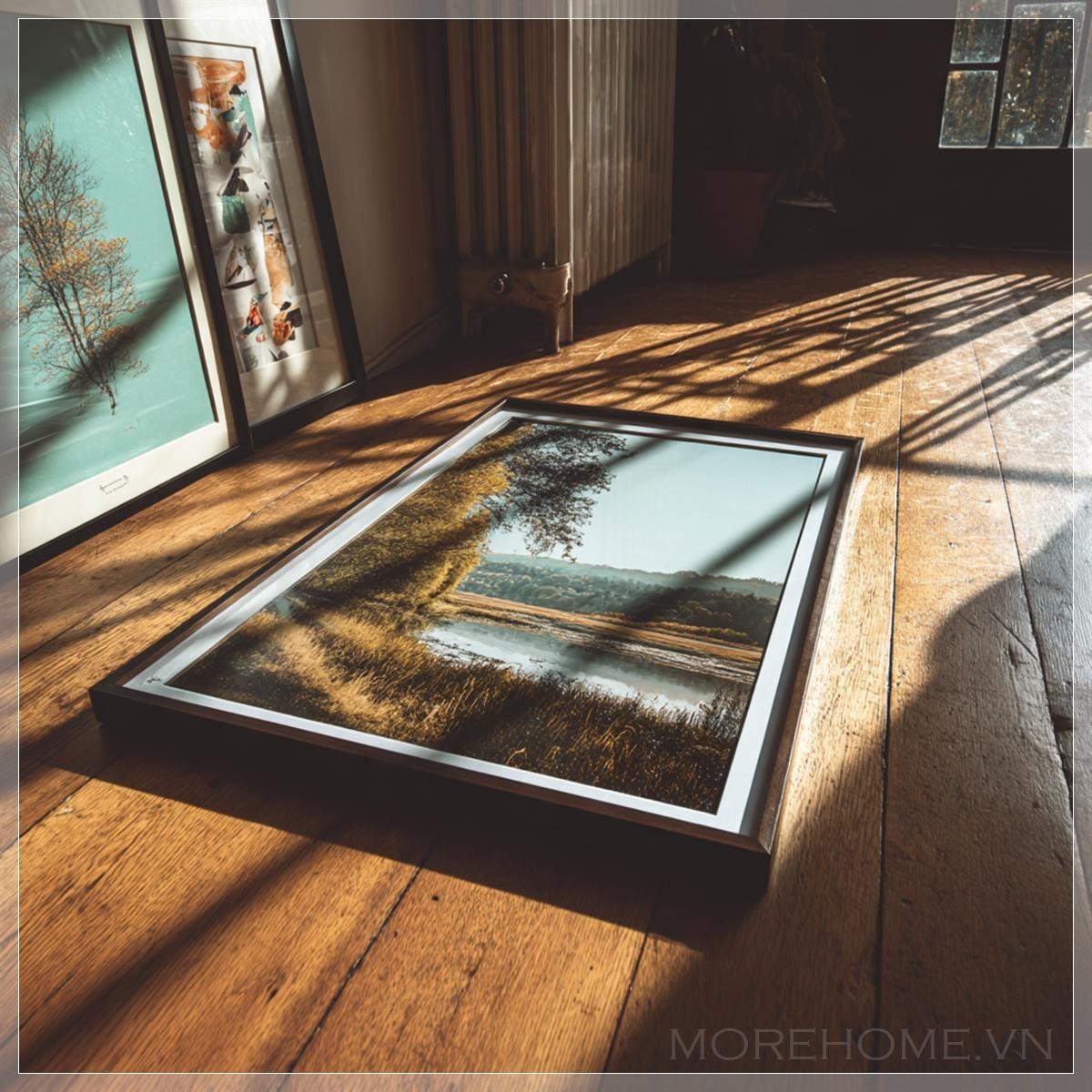 Khung ảnh được đặt trên sàn nhà, cho phép mọi người có thể dễ dàng thưởng thức từng chi tiết của bức tranh. Bức ảnh phản chiếu ánh sáng nhẹ nhàng từ cửa sổ, tạo ra một không gian vừa lãng mạn, vừa cổ điển. Những phản chiếu trên mặt sàn gỗ tạo thêm chiều sâu cho không gian, làm cho phòng khách trở nên sống động và đầy cảm hứng.