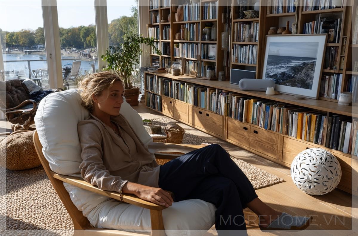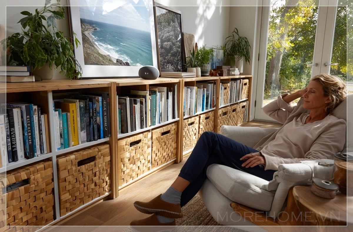 Ở góc phòng, một người phụ nữ thư giãn trong chiếc ghế bành, lắng nghe những giai điệu từ chiếc loa nổi. Làn sóng âm thanh du dương hòa quyện với không gian thanh bình của căn phòng. Cô có mái tóc xoăn ngắn, được buộc thấp gọn gàng, mặc chiếc quần âu màu xanh navy và áo pastel màu hồng nhạt, đôi tất xám và giày da nâu. Một bàn tay nhẹ nhàng đặt trên đầu, thư thái tận hưởng từng phút giây trong không gian yên bình này.