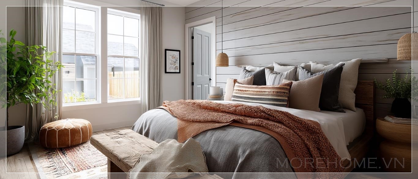 Trong không gian phòng ngủ mang đậm dấu ấn nhà trang trại hiện đại, các bức tường được bao phủ bởi lớp gỗ shiplap trắng, tạo nên một vẻ ngoài ấm cúng nhưng không kém phần tinh tế. Ánh sáng tự nhiên từ cửa sổ lớn chiếu vào, làm tôn lên màu sắc nhẹ nhàng của gỗ và các chi tiết trang trí xung quanh. Chiếc giường lớn với chăn bông ấm áp, đệm mềm mại và gối ôm chất liệu vải tự nhiên tạo ra một không gian thư giãn lý tưởng.