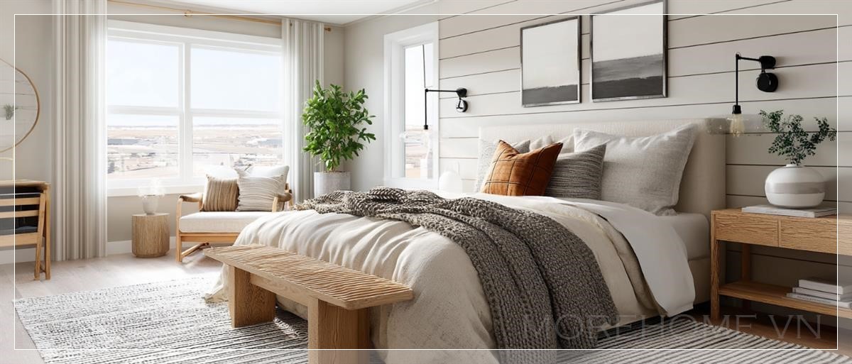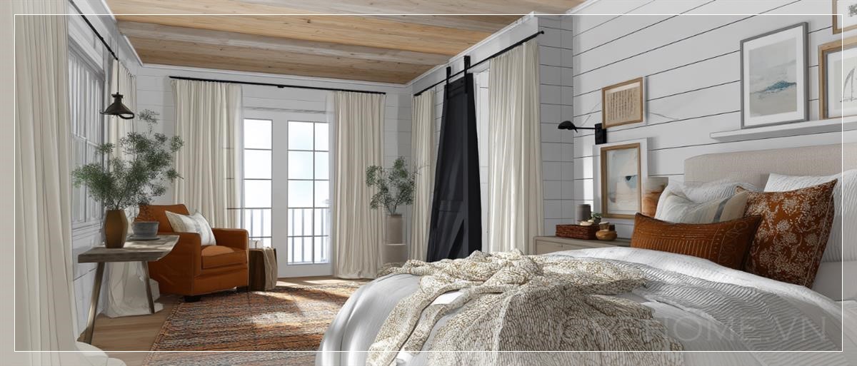 Với sự kết hợp hài hòa của các vật liệu tự nhiên, căn phòng không chỉ mang đến cảm giác thoải mái mà còn đầy đủ phong cách. Các chi tiết như chiếc thảm dày với họa tiết giản dị, những chiếc đèn bàn nhỏ xinh cùng với những món đồ trang trí nhỏ gọn làm nổi bật vẻ đẹp mộc mạc và giản dị của phong cách nhà trang trại. Mỗi góc nhỏ đều được chăm chút, tạo ra một không gian ngủ không chỉ đẹp mà còn đầy ắp sự ấm áp và thư giãn.