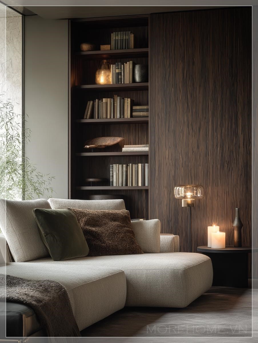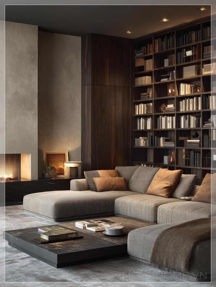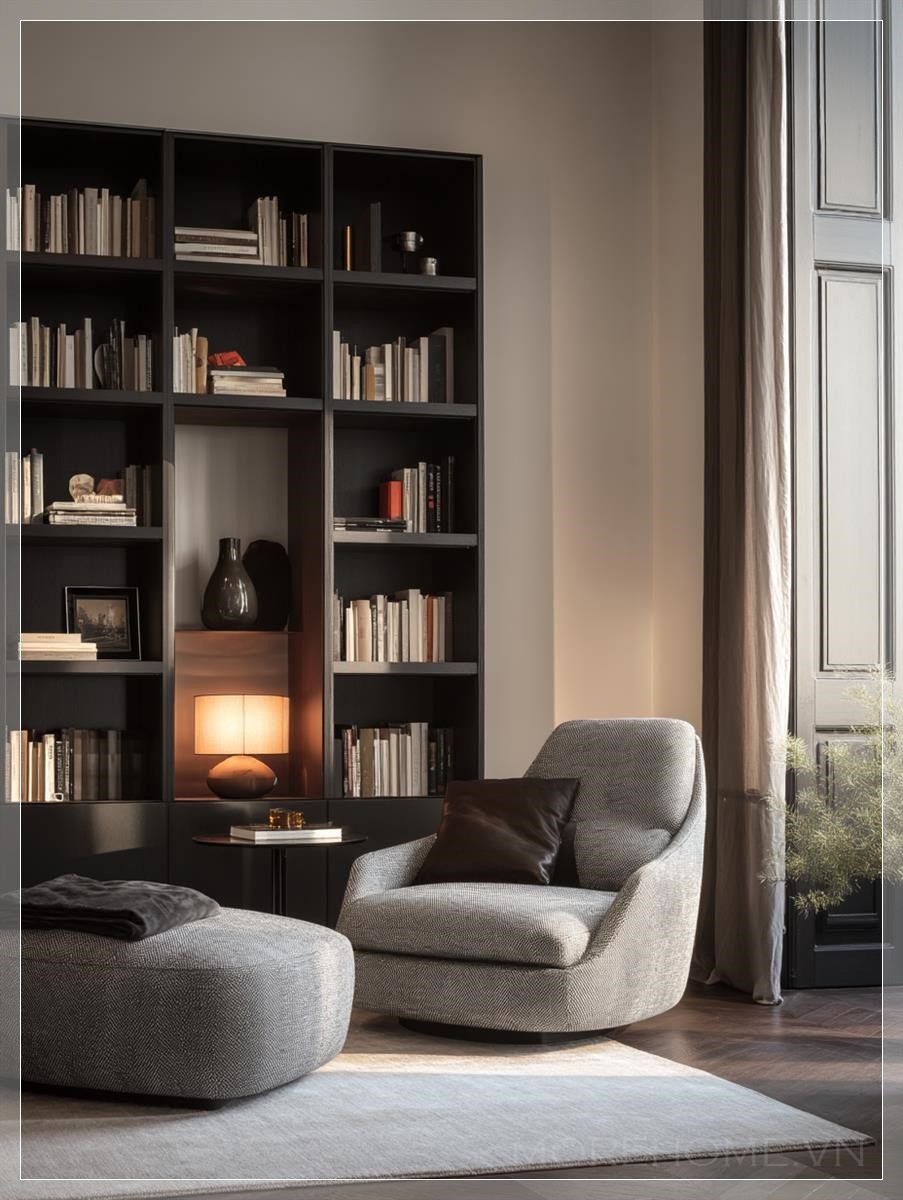Chất liệu của những món đồ nội thất, từ ghế sofa đến bàn trà, đều được lựa chọn kỹ lưỡng, tôn lên vẻ đẹp của sự sang trọng giản đơn. Từng chi tiết trong căn phòng đều mang lại cảm giác tinh tế, từ chất liệu vải bọc ghế cho đến cách bố trí các món đồ nội thất sao cho chúng không chỉ hòa quyện với không gian mà còn tôn vinh vẻ đẹp của sự đơn giản, thanh lịch.