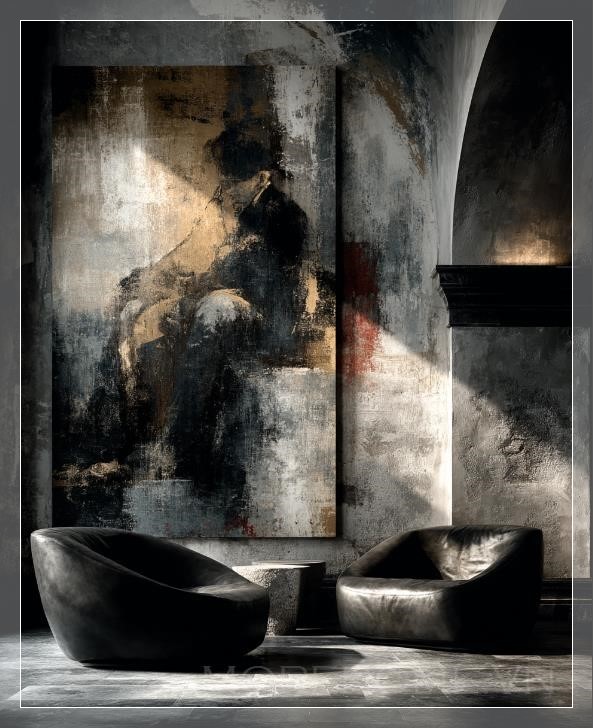 Thảm dệt kim với kết cấu đặc biệt tạo nên điểm nhấn mềm mại dưới chân, đồng thời làm dịu đi sự lạnh lẽo của đá cẩm thạch và tạo sự liên kết cho tổng thể không gian. Những bức tranh cổ điển, mang đậm ảnh hưởng của các bậc thầy vĩ đại, được kết hợp với các tác phẩm nghệ thuật hiện đại, làm nổi bật vẻ đẹp tinh tế và sự hài hòa giữa các thời kỳ khác nhau.