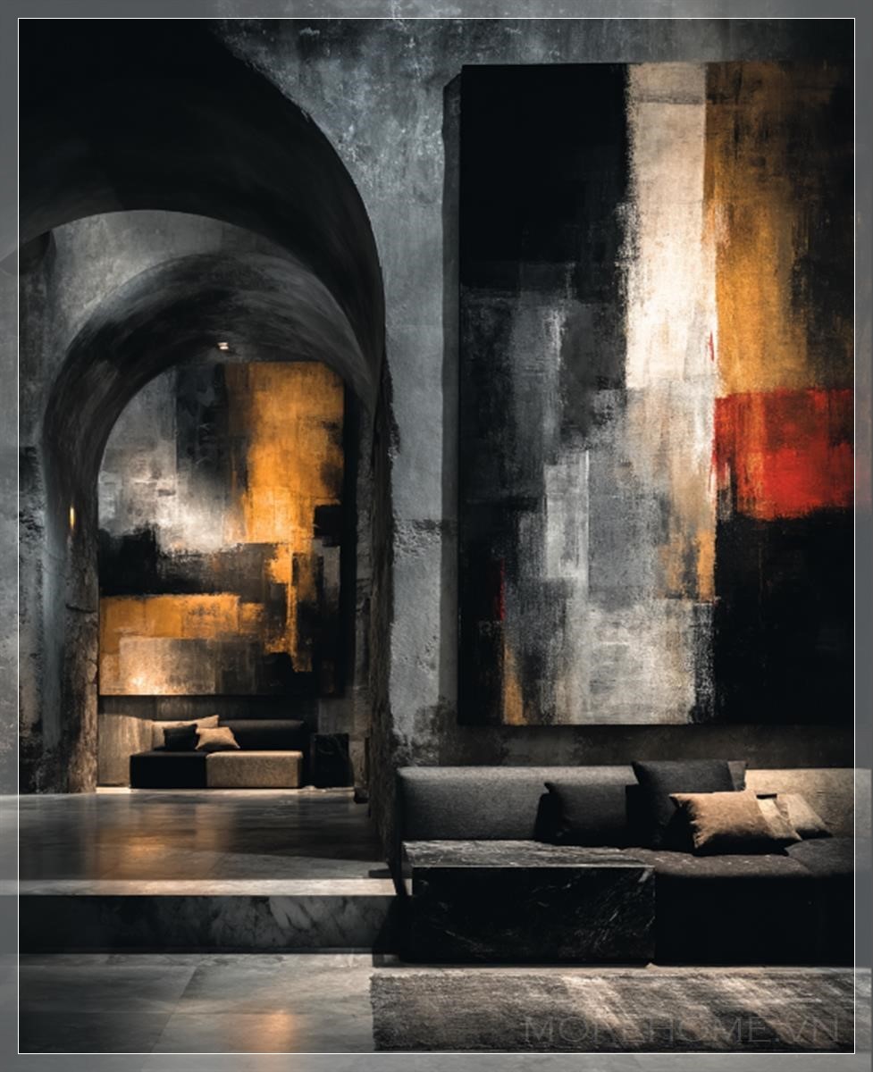 Trong không gian nội thất siêu cao cấp này, sự giao thoa hoàn hảo giữa phong cách cổ điển và hiện đại tạo nên một bầu không khí không thể nhầm lẫn. Những chiếc bàn bằng đá cẩm thạch, được trang trí bằng các tác phẩm nghệ thuật hiện đại, đối lập với các bức tường sơn tranh tường tinh tế, khắc họa hình ảnh của một thời đại xưa. Cửa vòm cao rộng mở ra không gian rộng lớn, tạo cảm giác thăng hoa giữa quá khứ và hiện tại.
