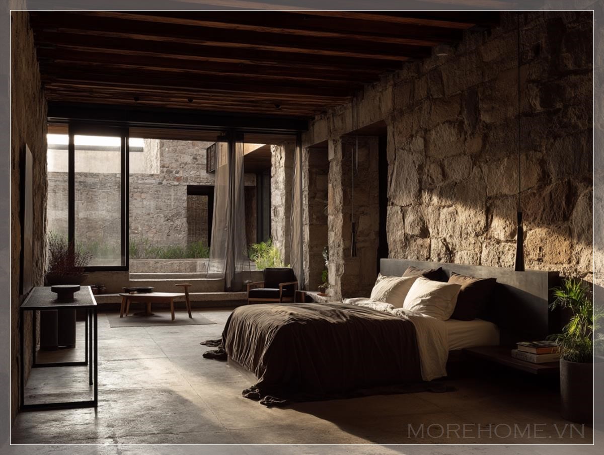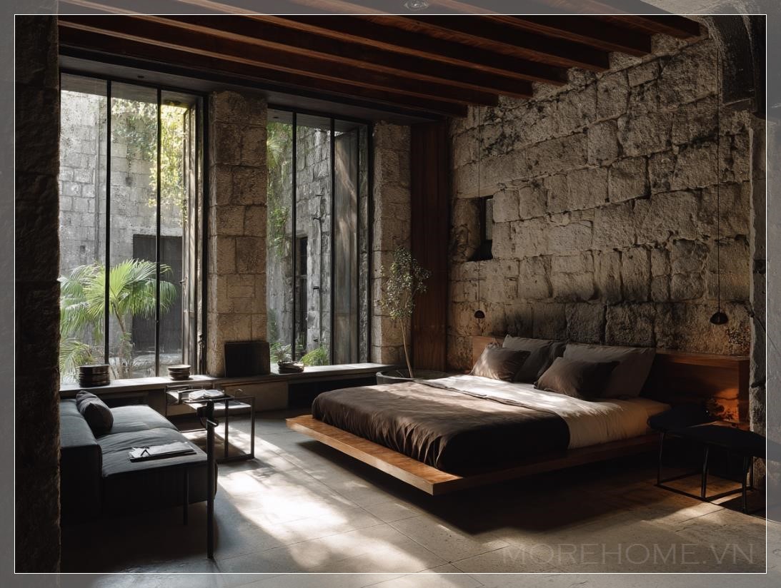 Tường đá phía sau giường không chỉ tạo ra một điểm nhấn mạnh mẽ mà còn mang lại cảm giác chắc chắn, gắn bó với thiên nhiên. Ánh sáng tự nhiên xuyên qua các cửa sổ lớn, chiếu vào không gian, làm dịu mắt và tạo ra một không khí thư giãn, mời gọi mọi người nghỉ ngơi. Từ bộ chăn ga gối nệm màu nâu sẫm đến những chiếc gối trắng tinh, mọi chi tiết đều hướng đến sự thanh thoát và nhẹ nhàng.