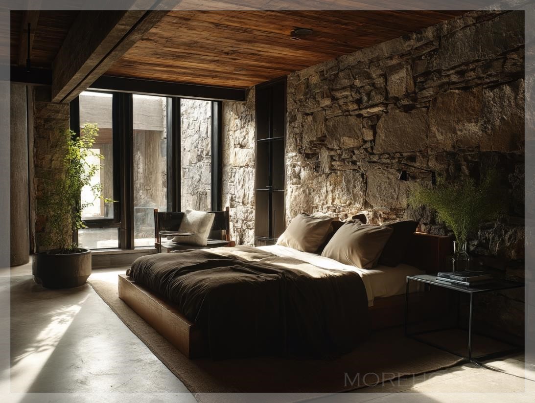 Bước vào một không gian tĩnh lặng và thanh bình, nơi sự hòa quyện giữa thiên nhiên và thiết kế hiện đại tạo nên một không gian phòng ngủ đầy cảm hứng. Phòng ngủ này mang phong cách khách sạn Mexico hiện đại với tường đá và trần nhà gỗ, là sự kết hợp hoàn hảo giữa vẻ đẹp mộc mạc và sự sang trọng tối giản.