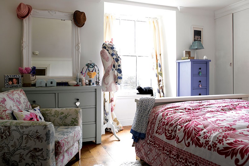 Bạn sẽ bị choáng ngợp bởi trong căn phòng này có quá nhiều thứ. Một chiếc giường vuông vắn với tấm rèm toát lên vẻ quý tộc, một bộ ghế sofa hoa văn bắt mắt như phòng khách, một bàn làm việc nhỏ nhắn, một góc để đọc sách, lại có một lò sưởi… Chắc hẳn đây là căn phòng dành cho một nghệ sỹ nào đó. Họ cần một không gian tổng hợp, nơi mà họ có thể làm bất kể thứ gì mà họ muốn. Nhưng có thể nói, mặc dù rất nhiều đồ đạc và nhiều chức năng nhưng căn phòng không hề bừa bộn. Nó vẫn thể hiện được tông màu chủ đạo là xanh dương và trắng, hài hòa, thanh bình.