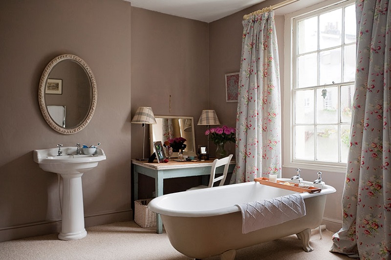 Thiết kế phòng tắm đặc biệt như thế này chắc hẳn chỉ có duy nhất một mà thôi. Bạn có thể “giam” mình cả ngày trong một không gian xinh đẹp đến vậy. Một chiếc bồn tắm được đặt ở giữa phòng, bên cạnh một khung cửa sổ lớn. Một bàn trang điểm nhỏ xinh được trang trí những lọ hoa thơm và những khung ảnh nhỏ.