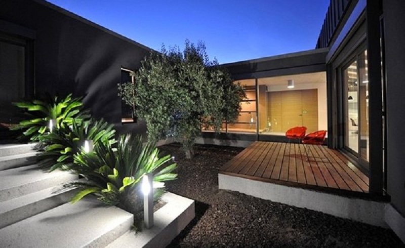 Cùng khám phá gần với phía trong của ngôi nhà nhé. Khu vực này trông thật hiện đại với việc sử dụng một cái lưới màu đen kết hợp với mái lợp trong suốt.