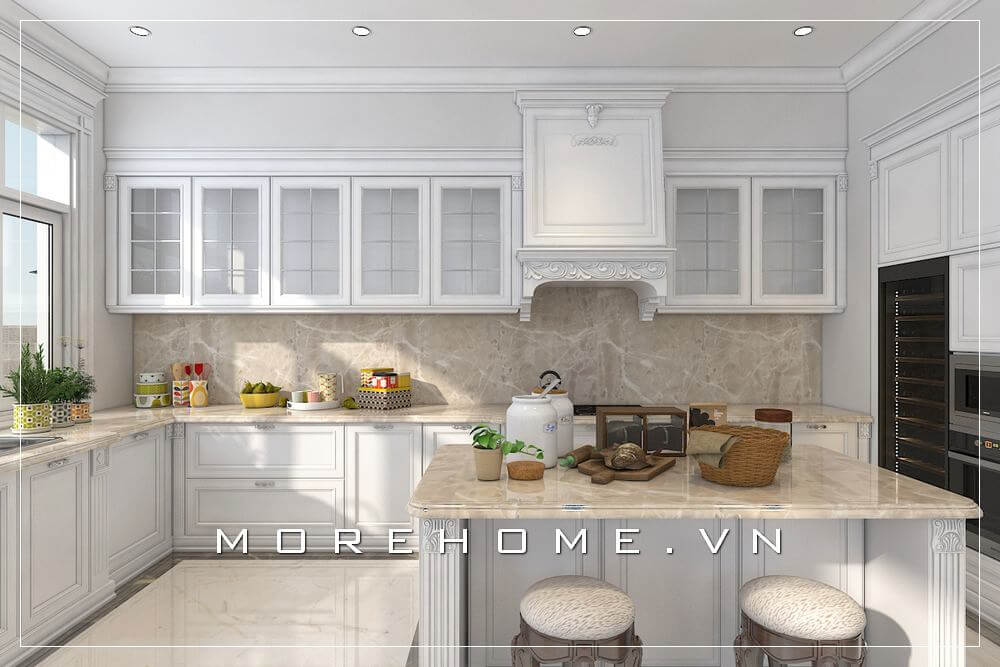 Mẫu tủ bếp gỗ tự nhiên, sơn trắng cao cấp cho phòng bếp biệt thự