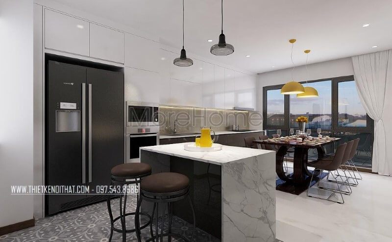 Bố trí nội thất phòng bếp hiện đại, sang trọng từ tủ bếp gỗ công nghiệp acrylic đồng màu cùng đá ốp cao cấp.