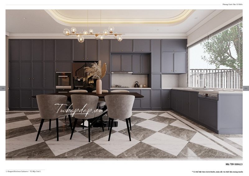Một không gian phòng bếp rộng lớn của biệt thự, nhà phố được thiết kế với ý tưởng cực kì sáng tạo. Bố trí tủ bếp chữ L màu xanh xám hot trend và bàn đảo đá tiện lợi.